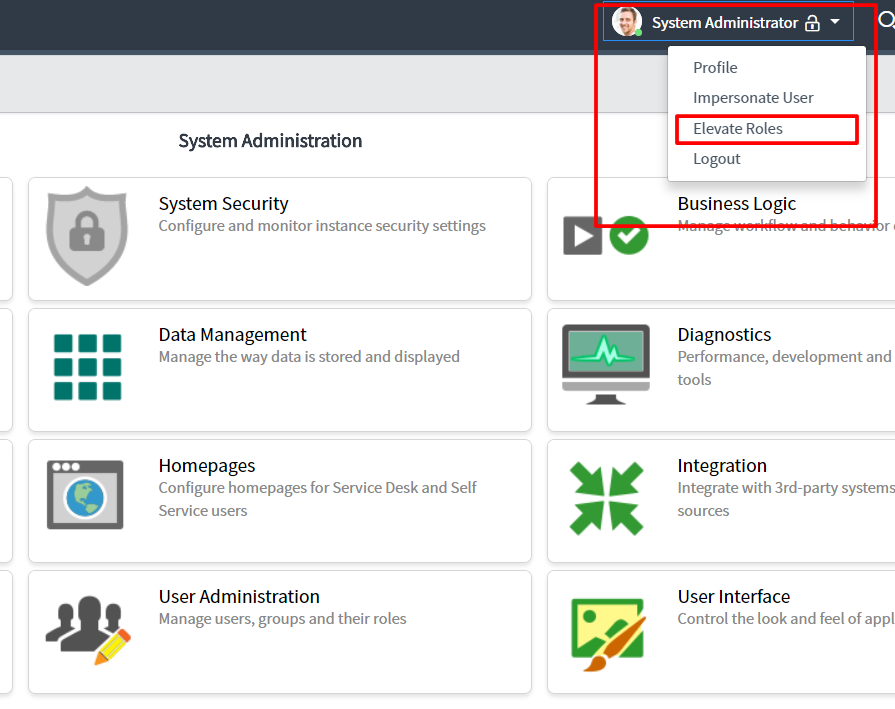 - [システム管理者] ドロップダウンボックスから、 [役割を昇格]を選択します。