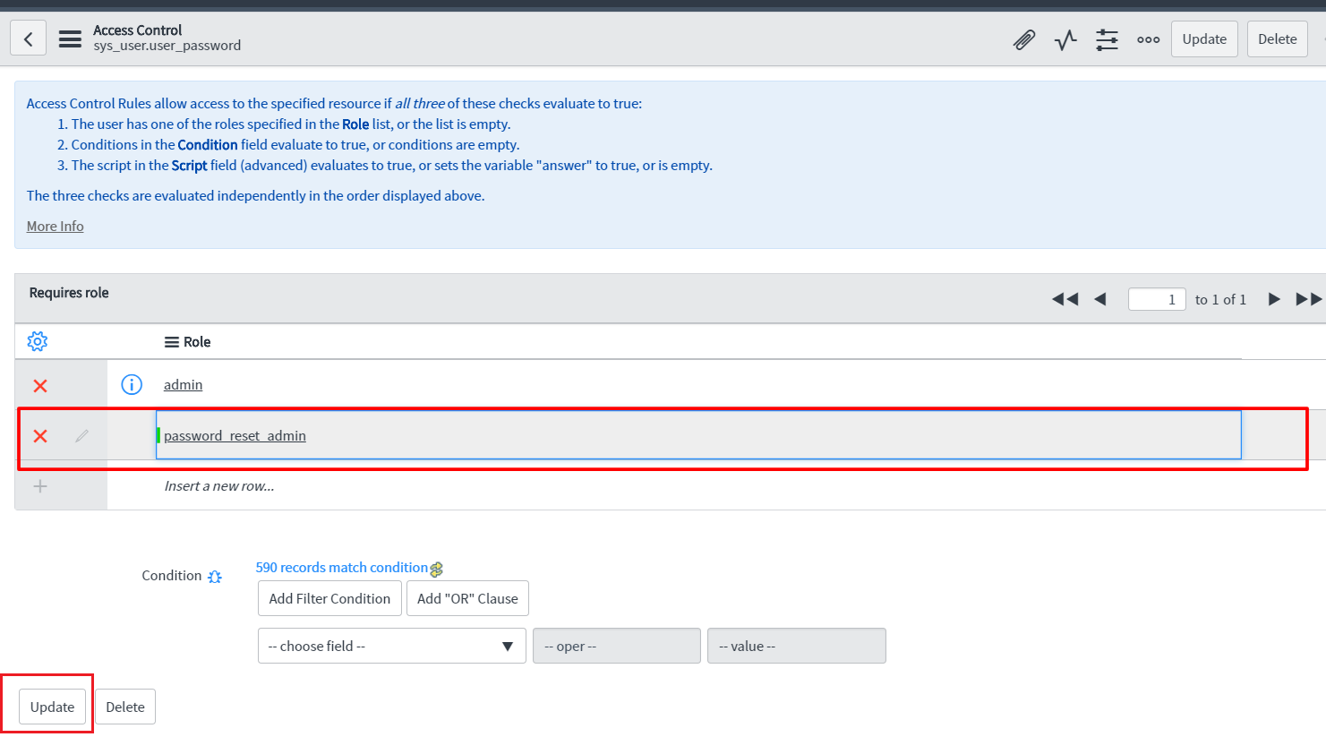 - [検索] リストに戻り、 [書き込み] 操作で [sys_user.user_password] フィールドを選択します。 [新しい行を挿入して変更を更新] を選択して、新しい役割を追加します。