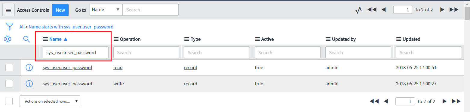- [名前] モジュールの [検索] フィールドに [sys_user.user_password]と入力します。表示されたリストから、 [読み取り] 操作で [sys_user.user_password] フィールドを選択します。