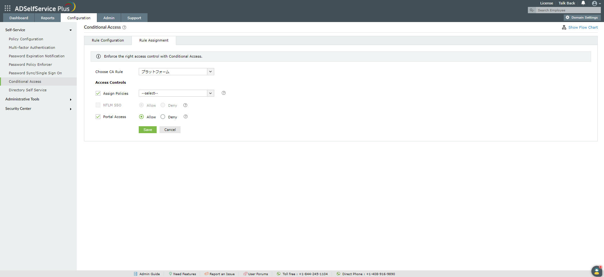 - また、NTLMシングルサインオンおよびADSelfService Plusポータルアクセスを許可またはブロックします。これらの設定は、選択したルールを満たす場合に適用されます。