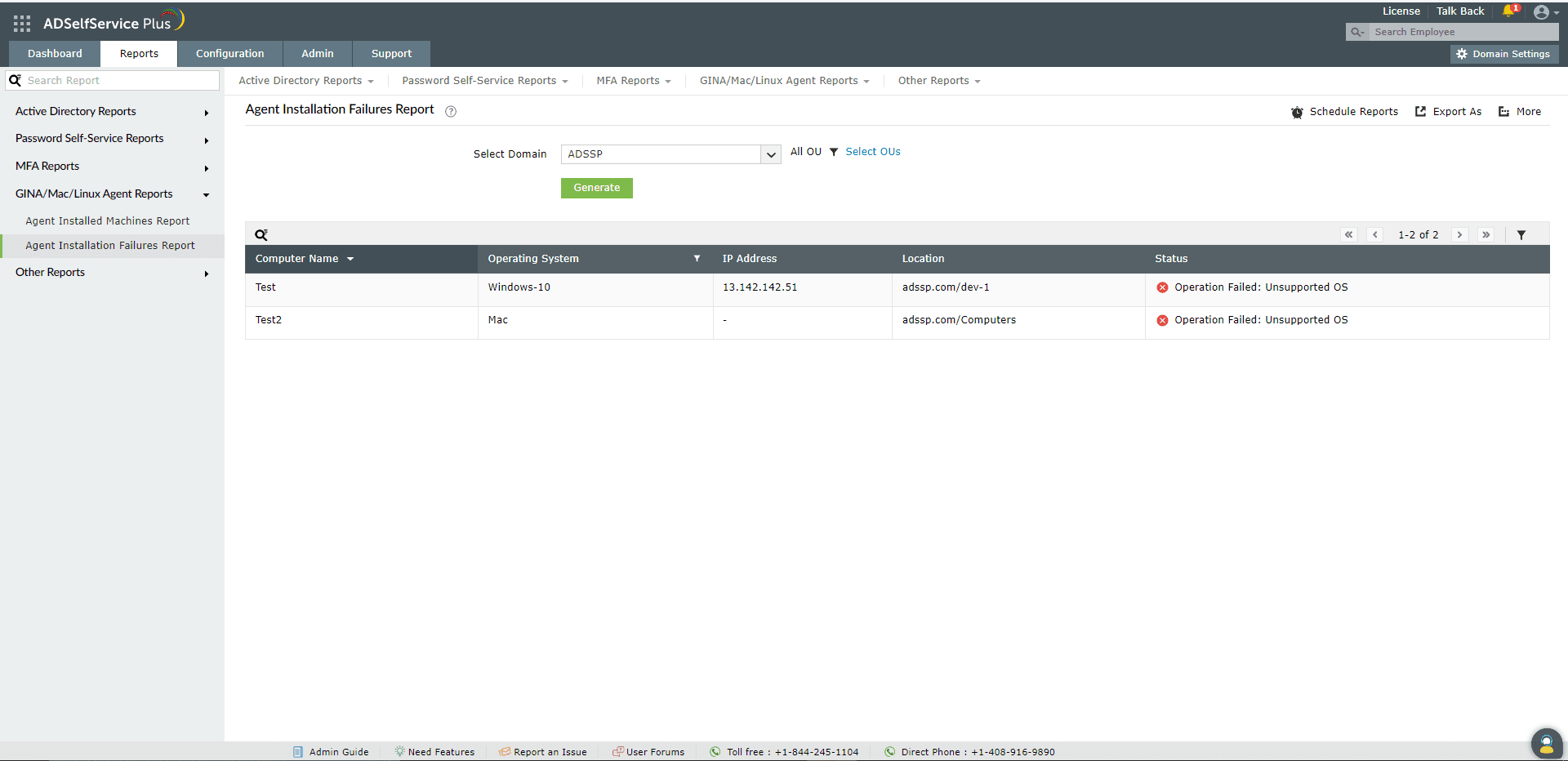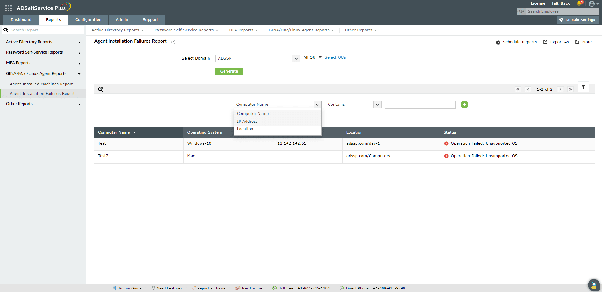 - 管理者またはオペレーター権限でADSelfService Plus管理ポータルにログインし、[レポート]→[エージェントレポート]→[エージェントインストール失敗レポート]に移動します。