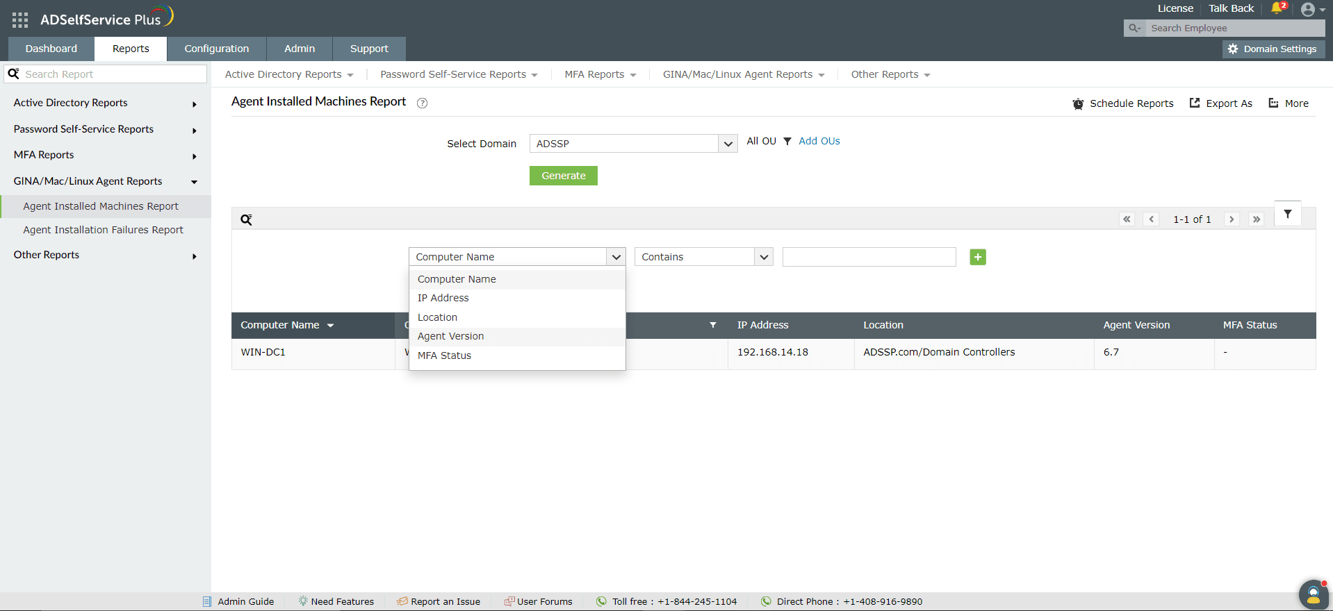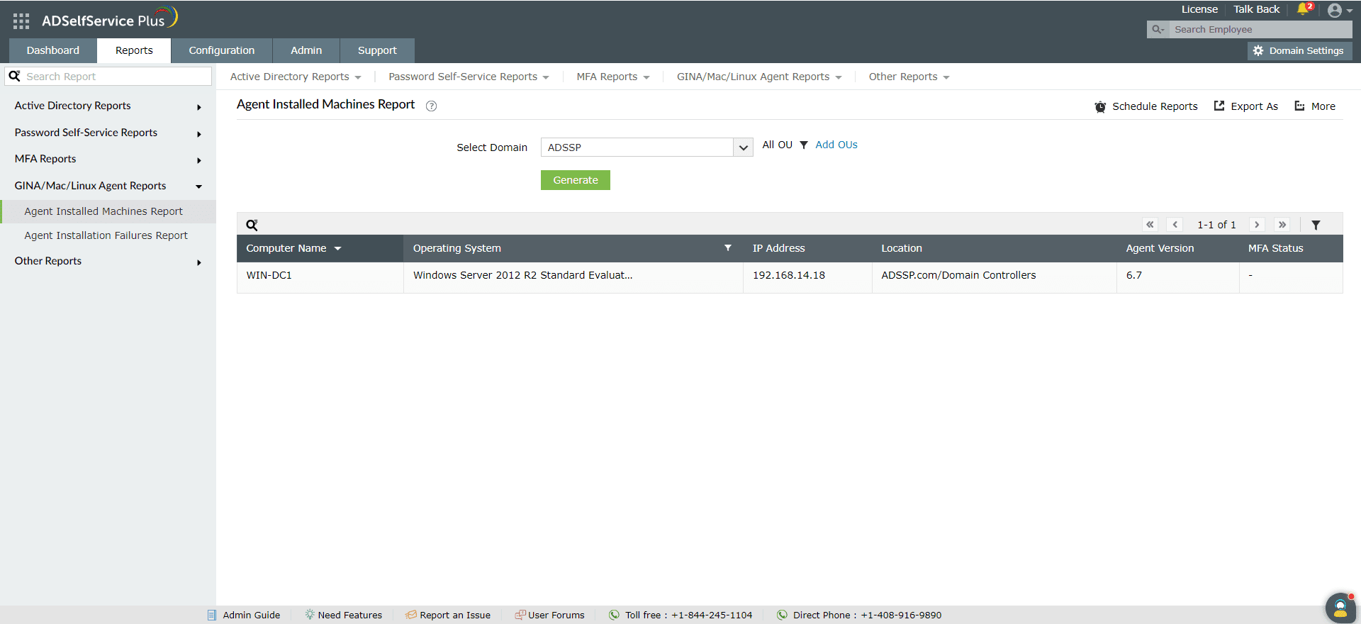 - 管理者またはオペレーター権限でADSelfService Plus管理ポータルにログインし、[レポート]→ [エージェントレポート]→[エージェントインストール済みレポート]に移動します。