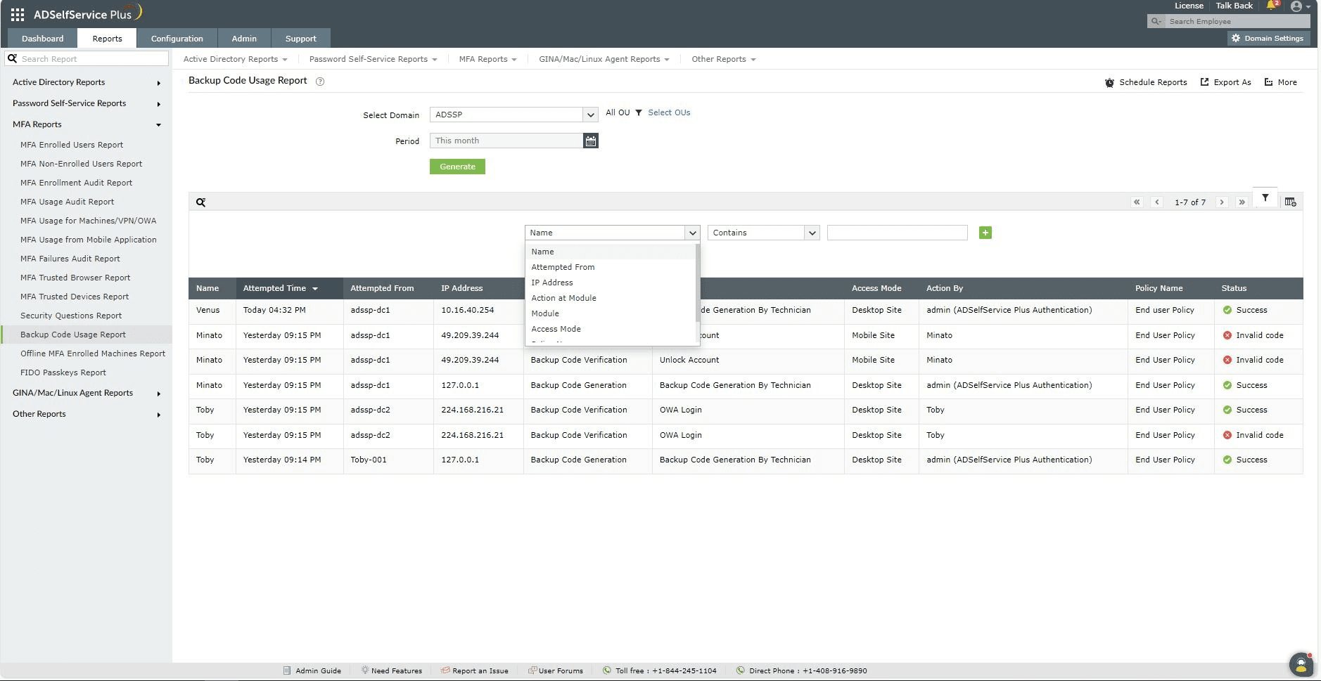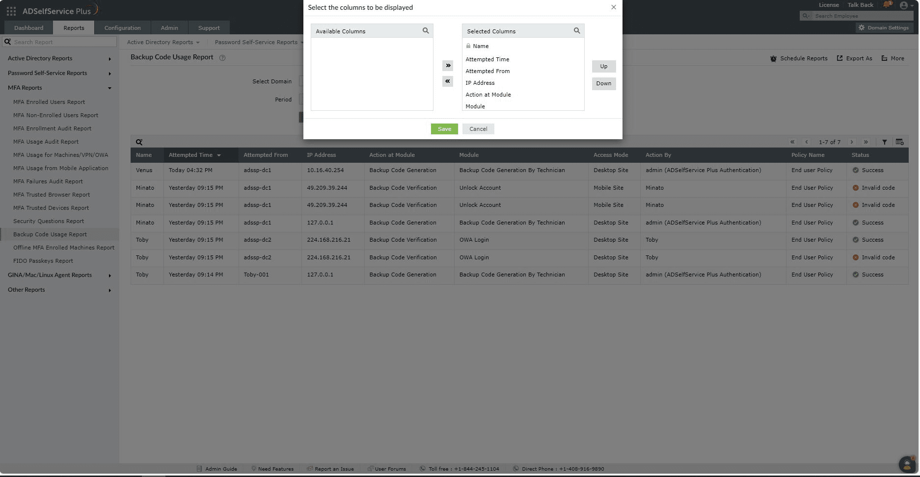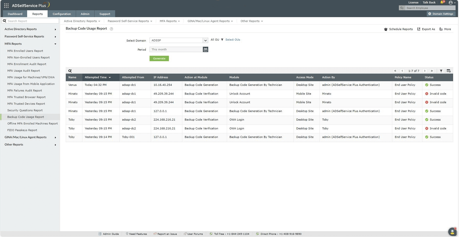 - 管理者またはオペレーター権限でADSelfService Plus管理ポータルにログインし、[レポート]→[MFAレポート]→[バックアップコード使用状況レポート]に移動します。