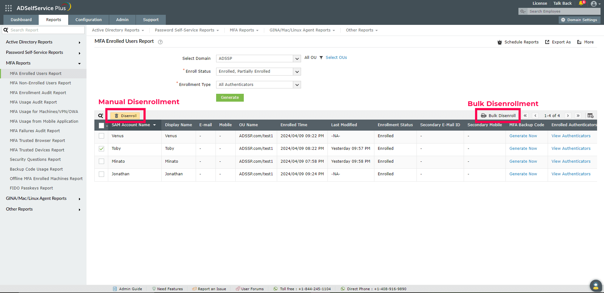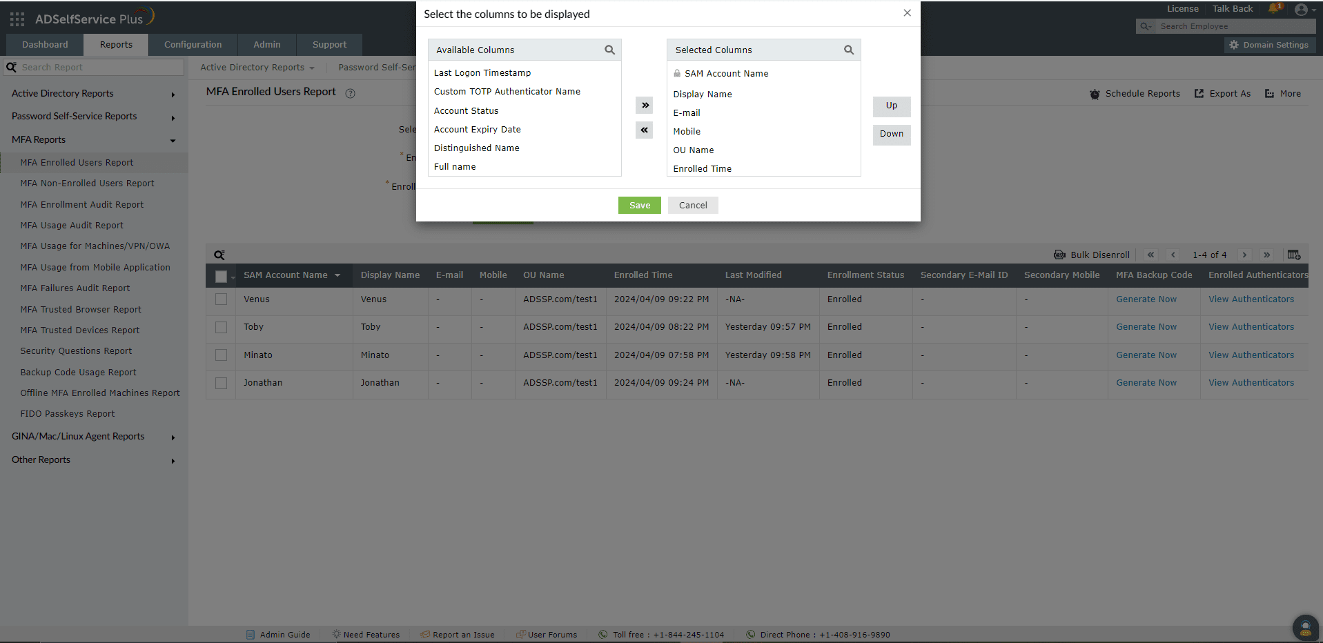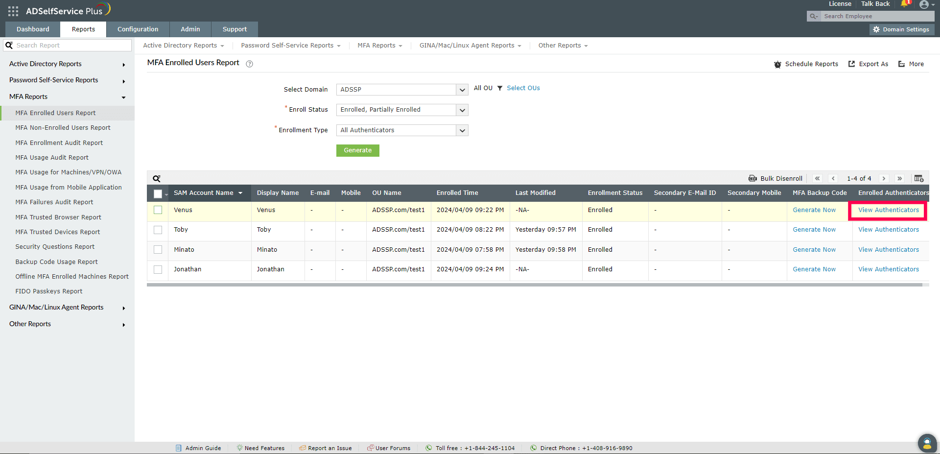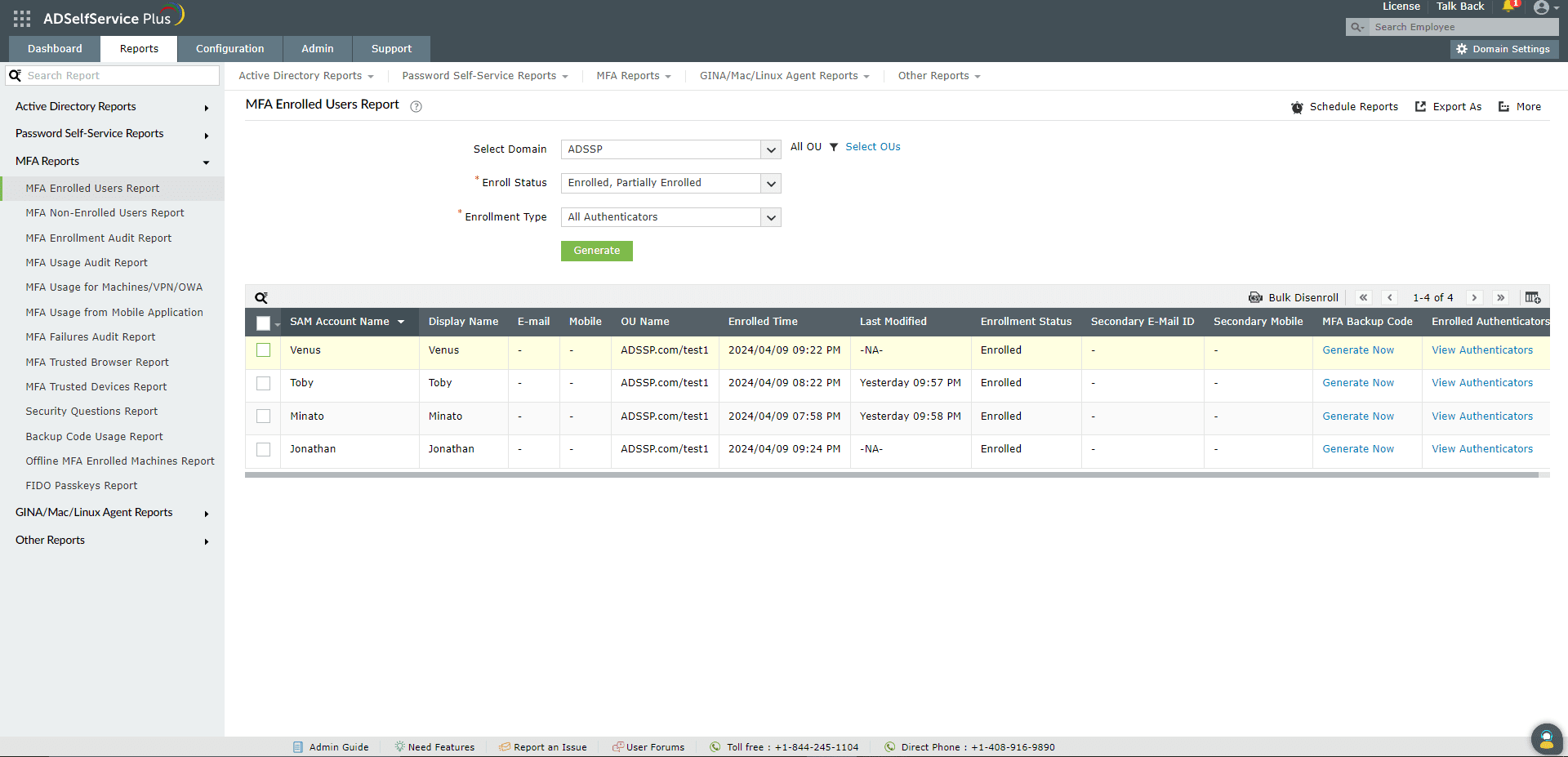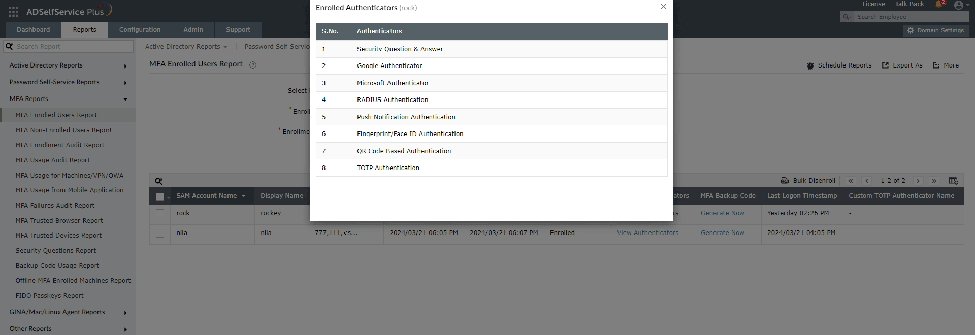 - 管理者またはオペレーター権限でADSelfService Plus管理ポータルにログインし、[レポート]→[MFAレポート]→[MFA登録ユーザーレポート]に移動します。