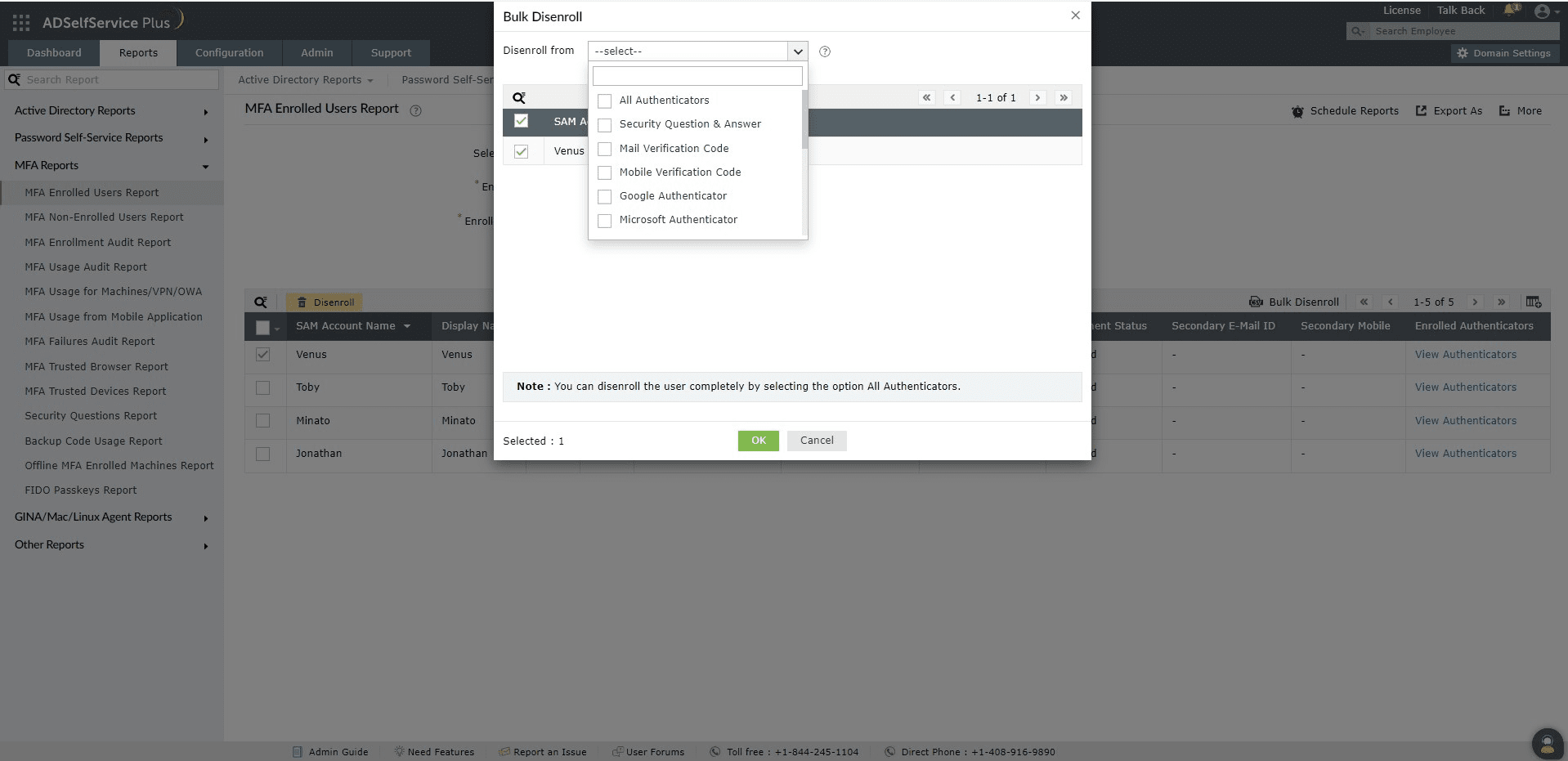 - CSV:レポートヘッダー右側のナビゲーションボタンの近くにある[一括で登録解除]をクリックします。開いたポップアップ画面で、登録を解除するユーザーのSAMアカウント名、携帯番号、メールID、セカンダリメールID、またはセカンダリモバイルを含むCSVファイルをアップロードします。CSVファイルをアップロード後、ユーザー登録を解除する認証システムを選択し、[OK]をクリックします。すべての認証システムからユーザーを登録解除するには、[すべてのAuthenticator]を選択します。