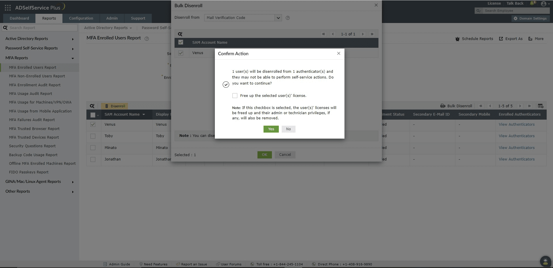 登録されている認証システムからユーザーを登録解除する際に、[選択したユーザーのライセンスを解放してください。]オプションを使用できます。このオプションを選択すると、選択したユーザーがすべての登録済み認証システムから削除され、ADSelfService Plusライセンスが解放されます。その結果、該当のユーザーはライセンスが付与されていない状態となり、管理者や技術担当者である場合、その権限も失うことになります。