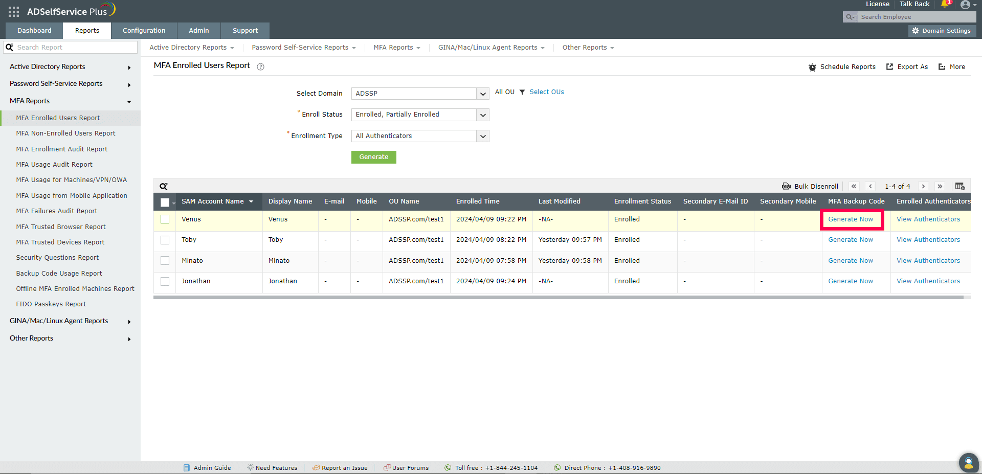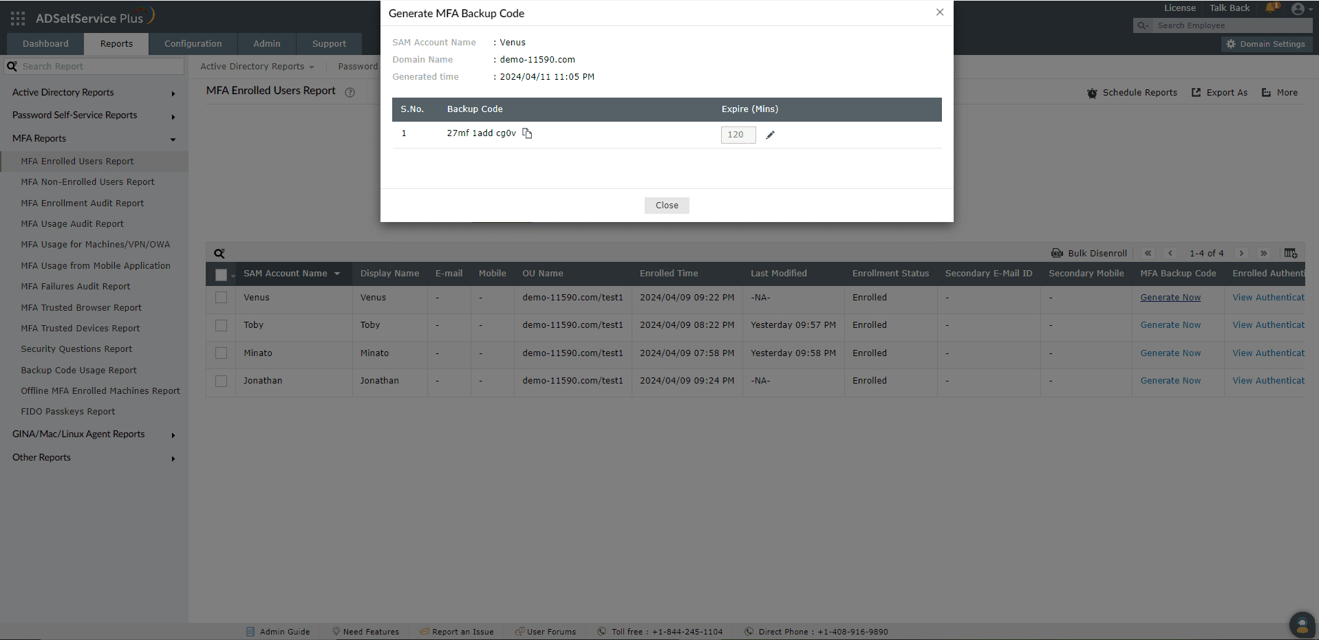 - MFA登録ユーザーレポートのMFAバックアップコード属性に移動します。[今すぐ生成]をクリックします。