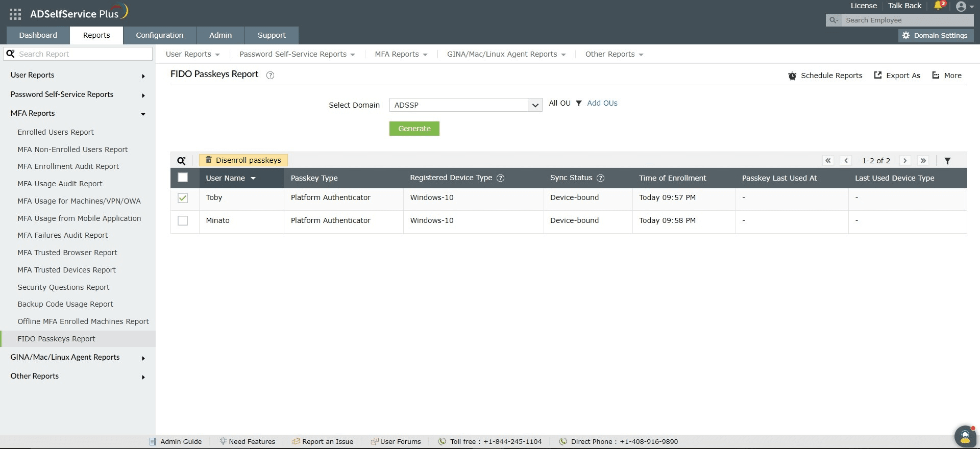 - 管理者またはオペレーター権限でADSelfService Plus管理ポータルにログインし、[レポート]→[MFAレポート]→[FIDOパスキーレポート]に移動します。