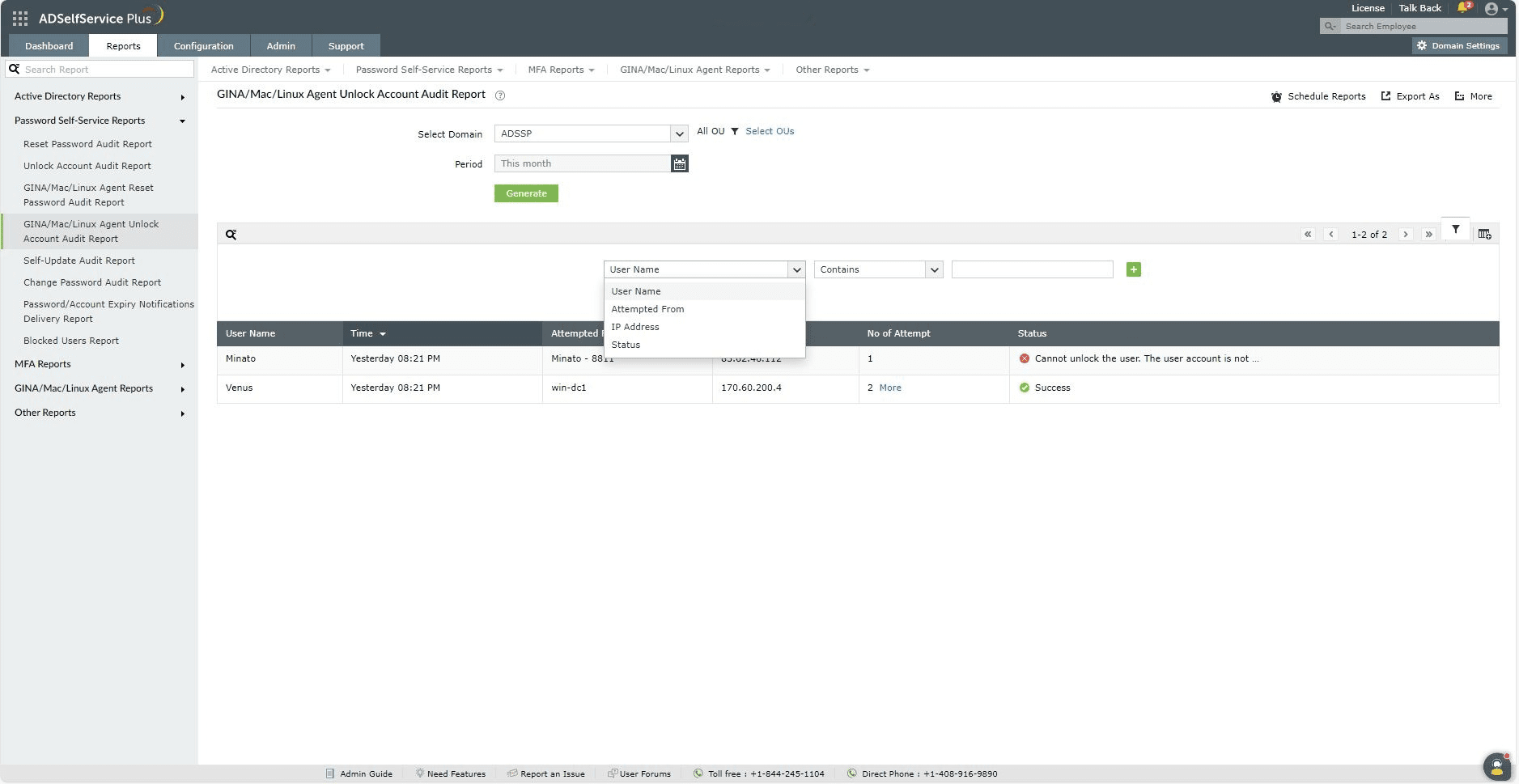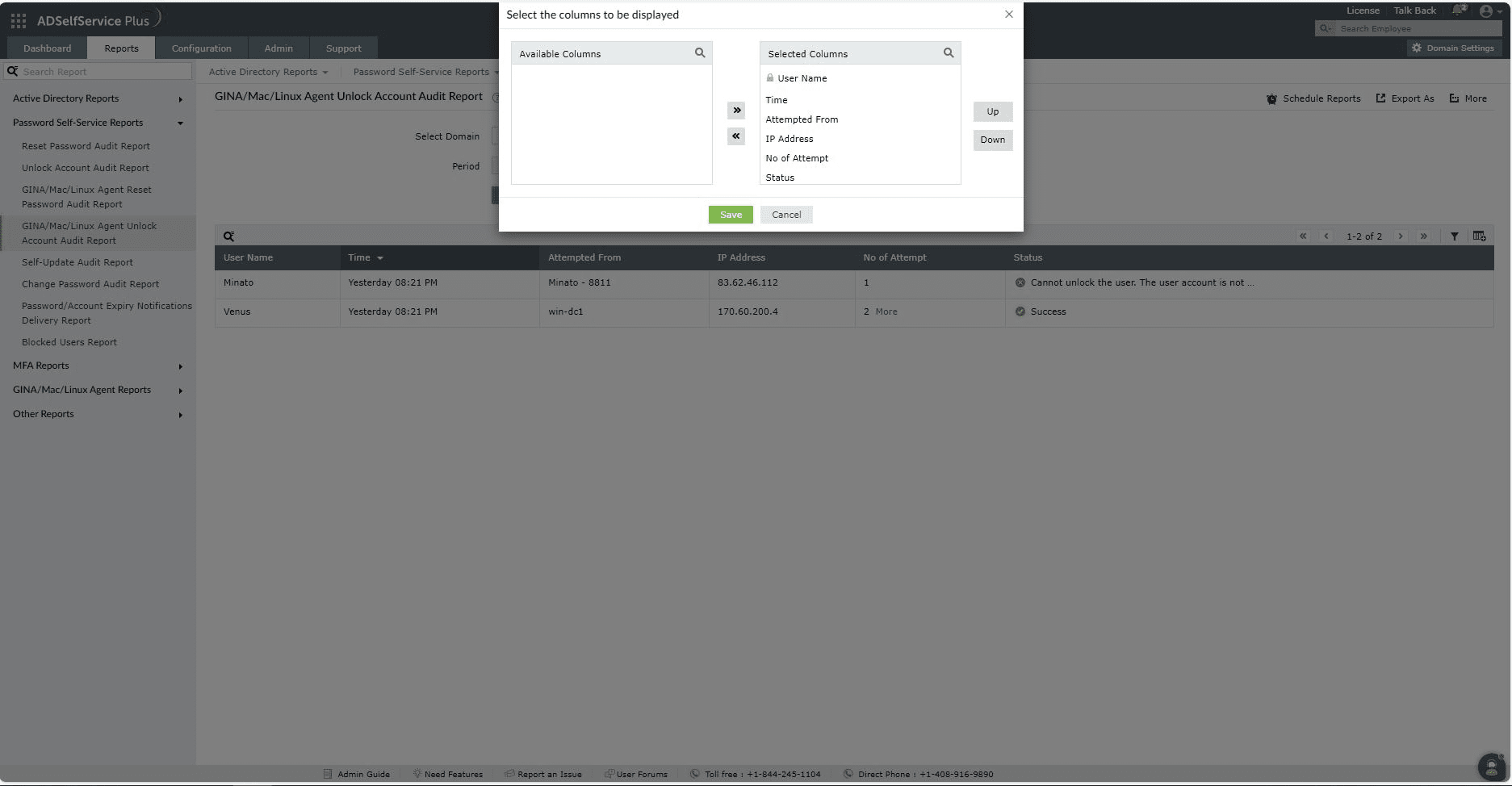 このレポートには、ユーザーがWindows、macOS、またはLinuxマシン上のログインエージェントを使用して、ログイン画面で実行したアカウントロック解除の詳細が表示されます。レポートには、ユーザー名、アカウントロック解除が試行された時間、ロック解除が試行されたデバイスのIPアドレス、合計試行回数、ステータス(アカウントがロック解除されたかどうか)などの情報が含まれます。