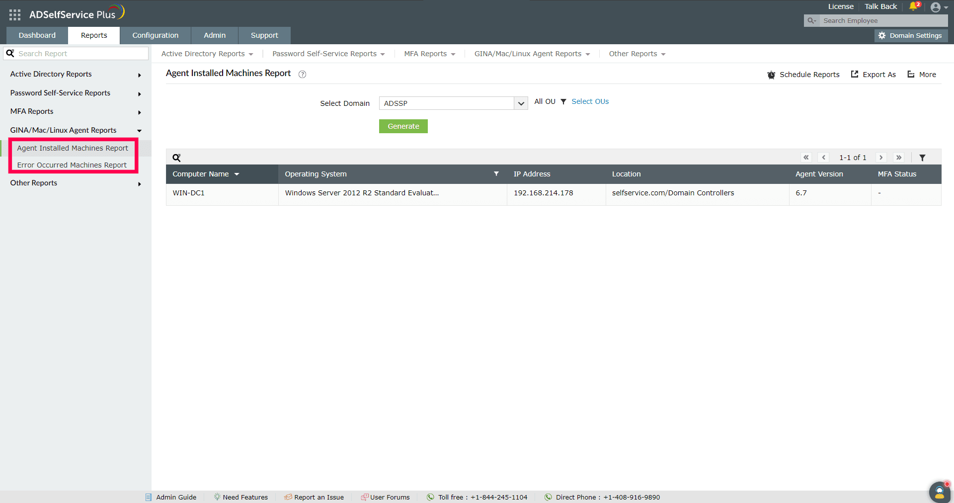 エージェントインストール失敗レポートには、ログインエージェントのインストールが失敗した、Windows、macOS、Linuxマシンの一覧が表示されます。このレポートには、エージェントのインストールに失敗したマシンのIPアドレスと名前、マシンで稼働しているOS、マシンが属するOUまたはグループ、インストール失敗の理由などの情報が表示されます。レポート作成手順については、こちらをご参照ください。
