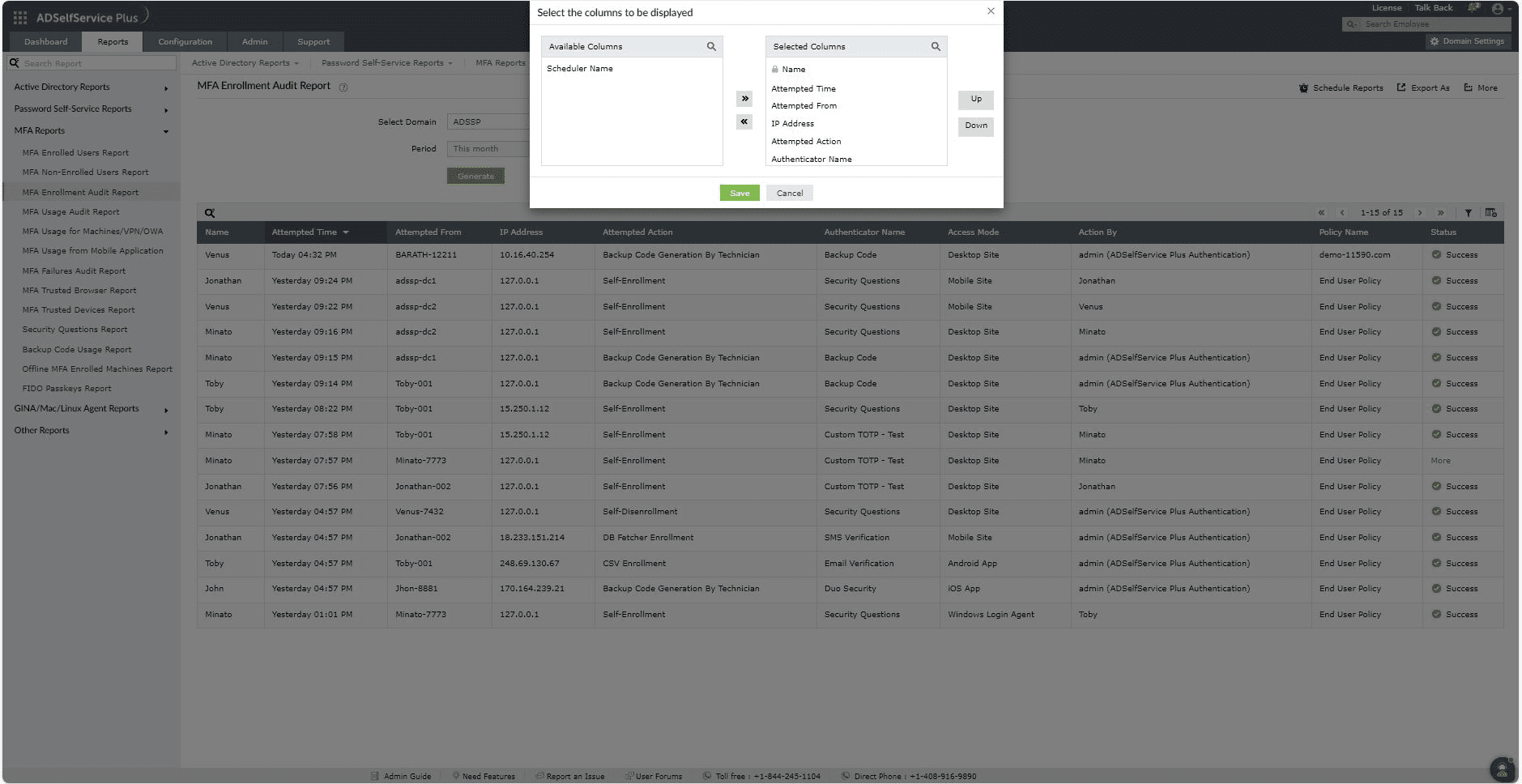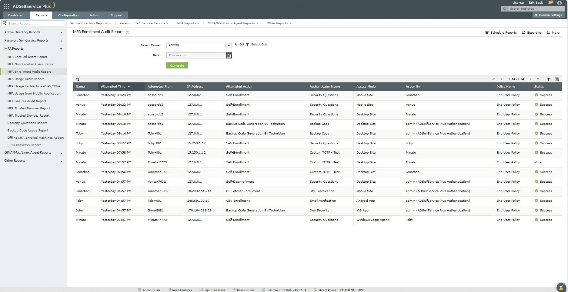 MFA登録監査レポートには、ADSelfService PlusでのすべてのMFA登録操作の情報が表示されます。このレポートには、ユーザー名、登録時間、登録した認証システム、IPアドレス、登録を試行したエンドポイントの種類、登録を試行したユーザー(ユーザーまたは管理者)の情報が含まれます。
