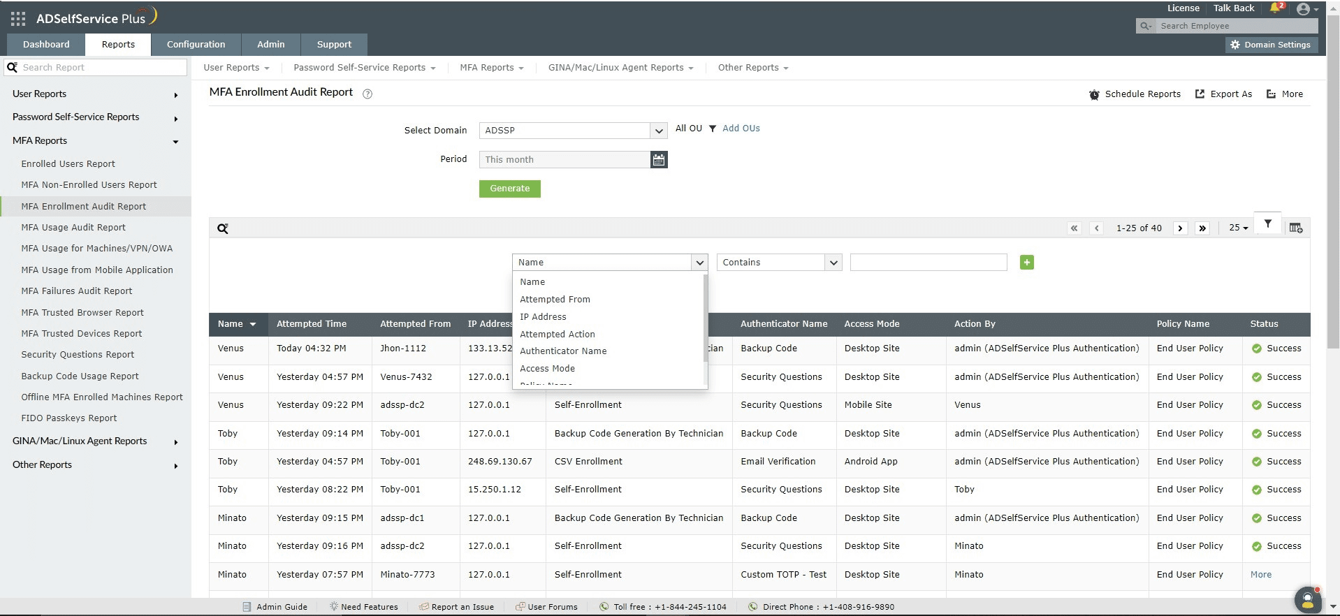 - 管理者またはオペレーター権限で ADSelfService Plus管理ポータルにログインし、[レポート]→[MFAレポート]→[MFA登録監査レポート]に移動します。