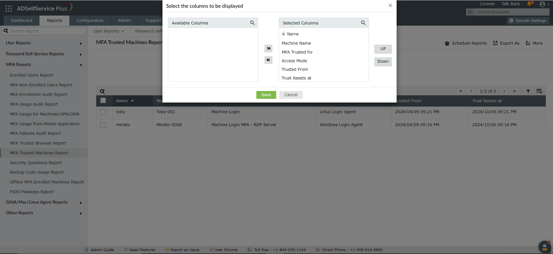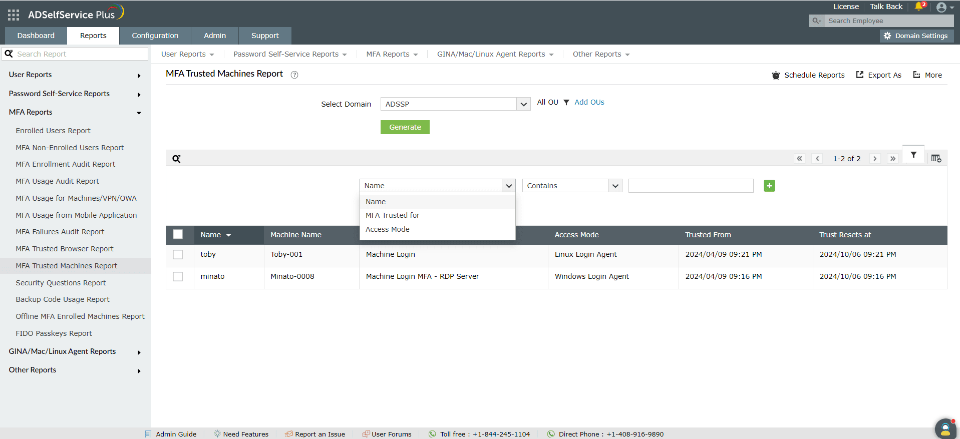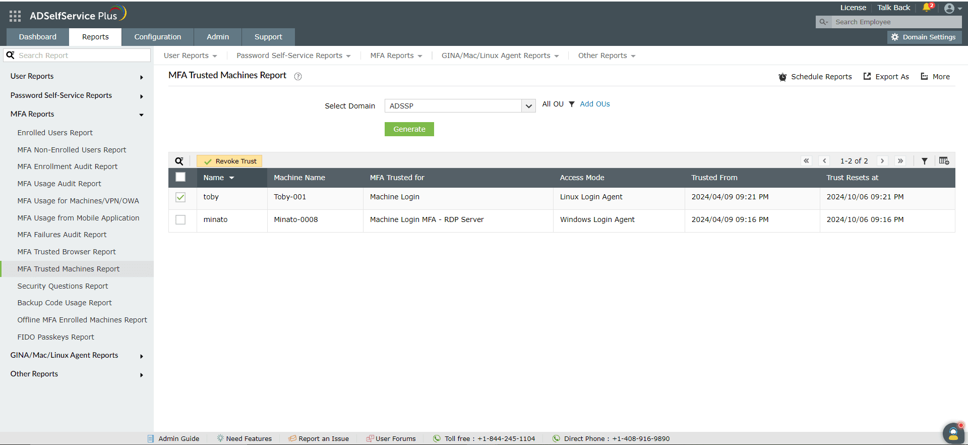 - 管理者またはオペレーター権限でADSelfService Plus管理ポータルにログインし、[レポート]→[MFAレポート]→[信頼済みマシンレポート]に移動します。