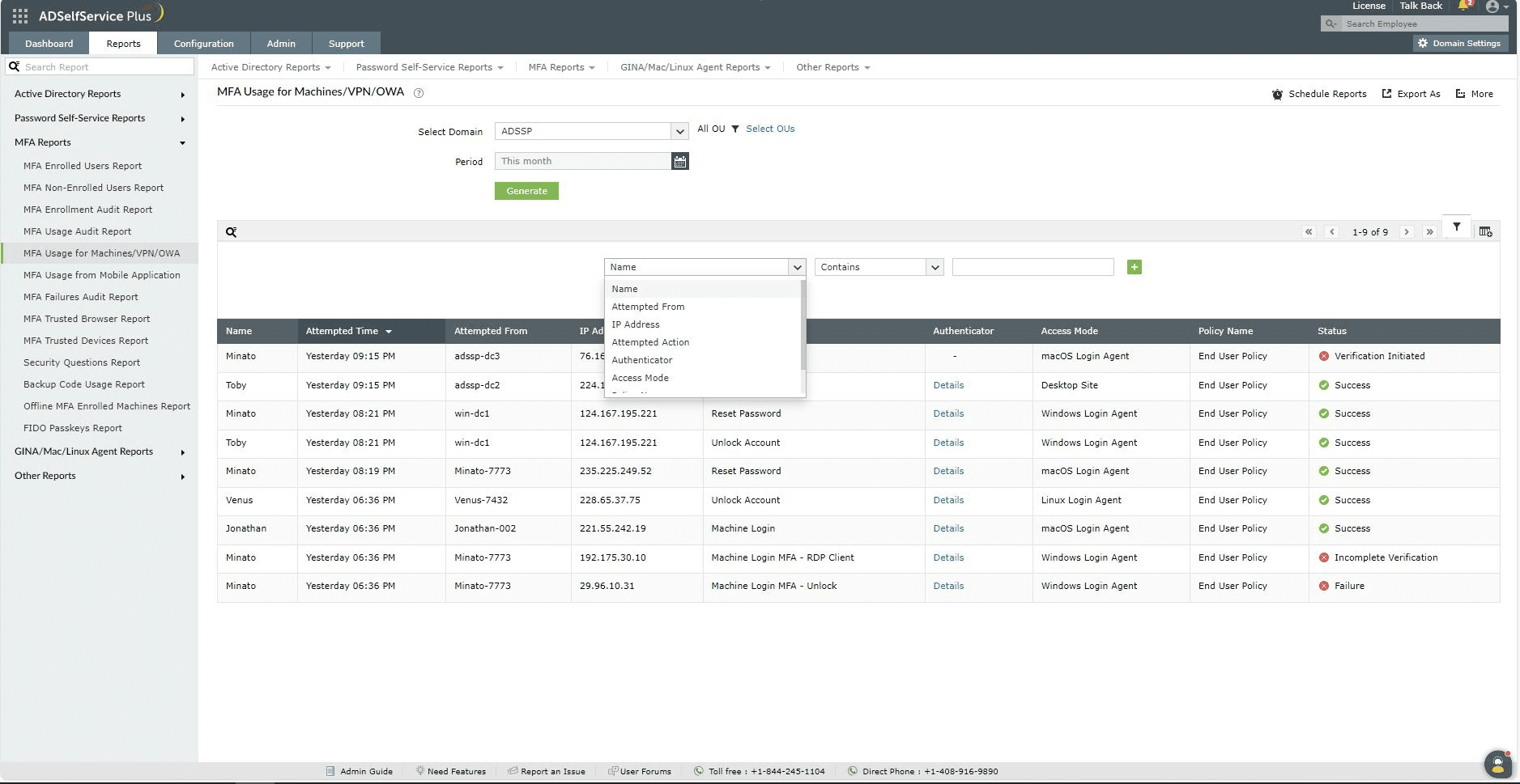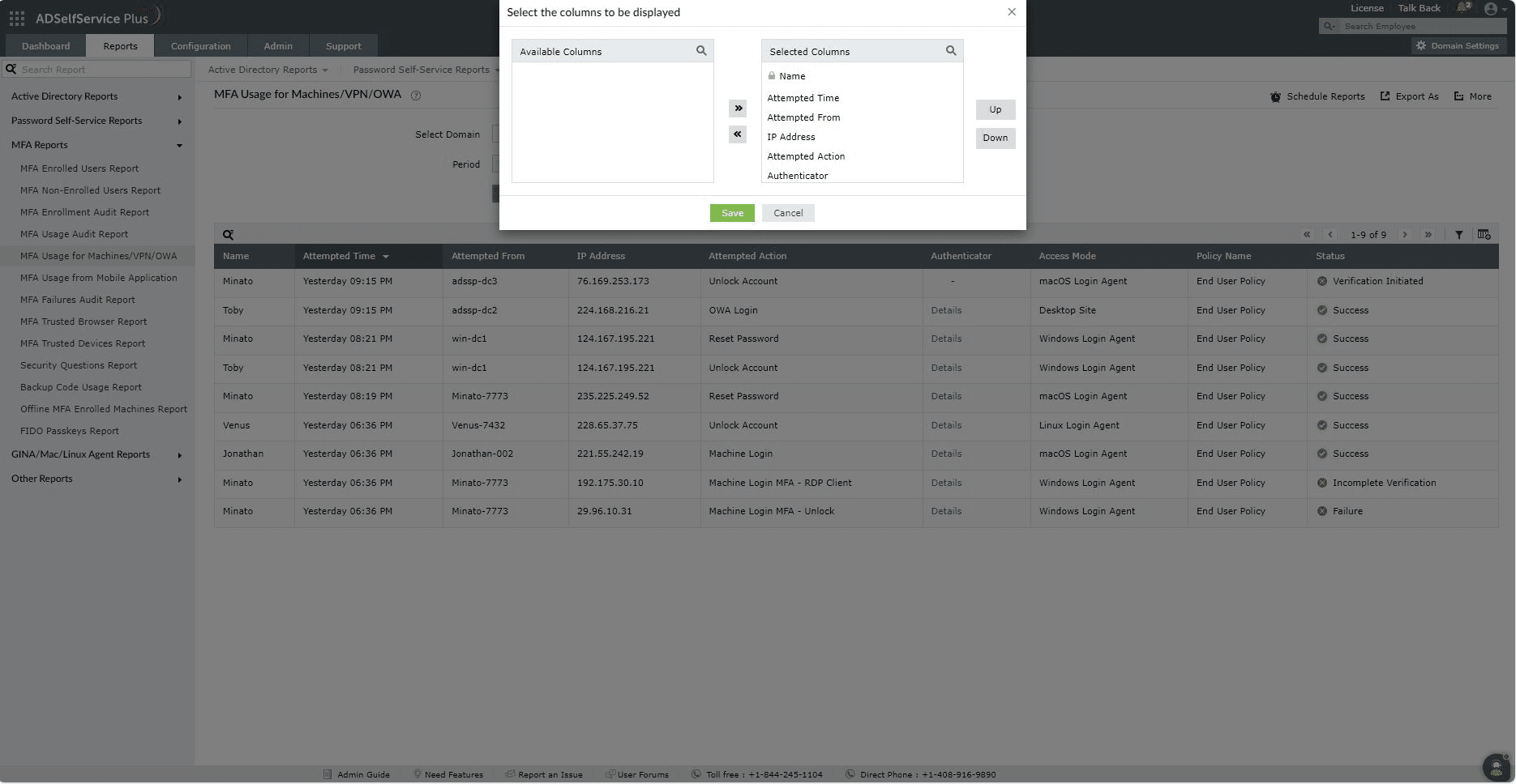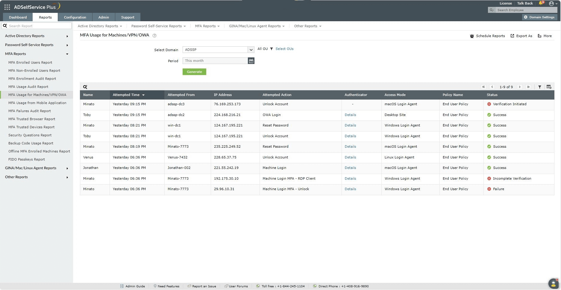 - 管理者またはオペレーター権限でADSelfService Plus管理ポータルにログインし、[レポート]→[MFAレポート]→[マシン/VPN/OWAのMFA使用状況監査レポート]に移動します。