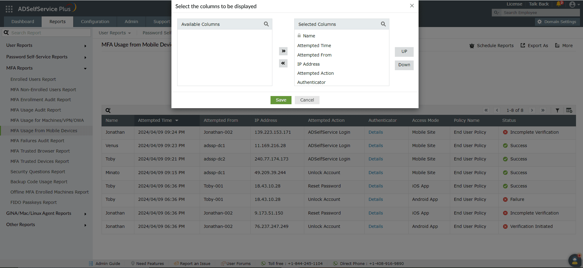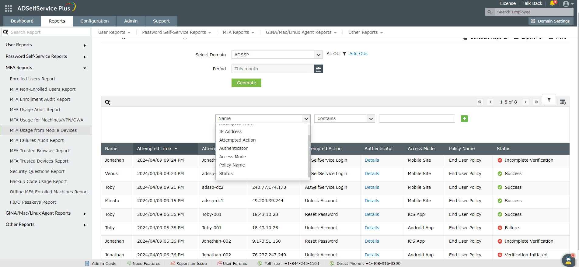 - 管理者またはオペレーター権限でADSelfService Plus管理ポータルにログインし、[レポート]→[MFAレポート]→[モバイルデバイス経由のMFA使用状況監査レポート]に移動します。