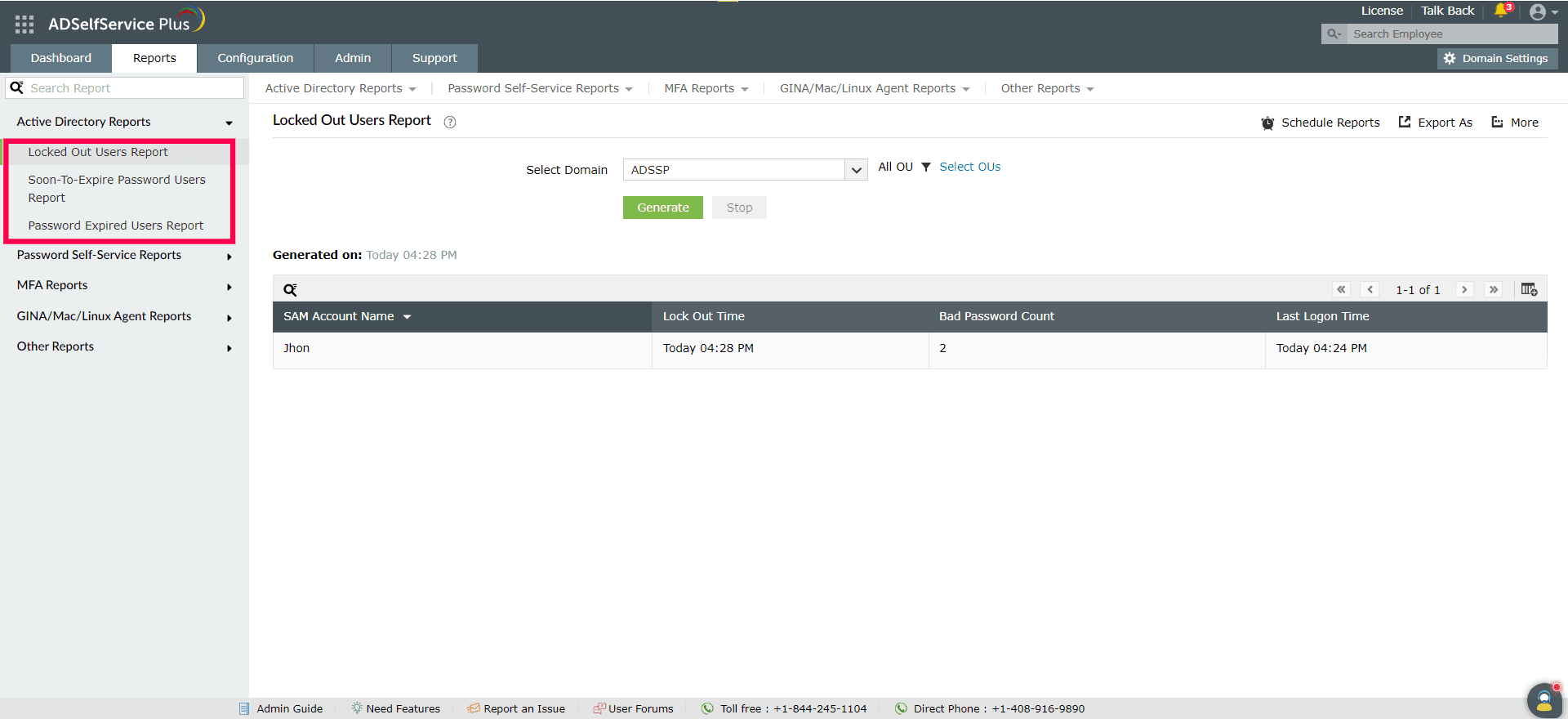 ドメインポリシーで、パスワード入力ミスなどによる認証失敗に対して設定したしきい値を超えると、ユーザーはアカウントからロックアウトされます。ロックアウトユーザーレポートには、アカウントからロックアウトされたユーザーの詳細が表示されます。レポート作成手順については、こちらをご参照ください。