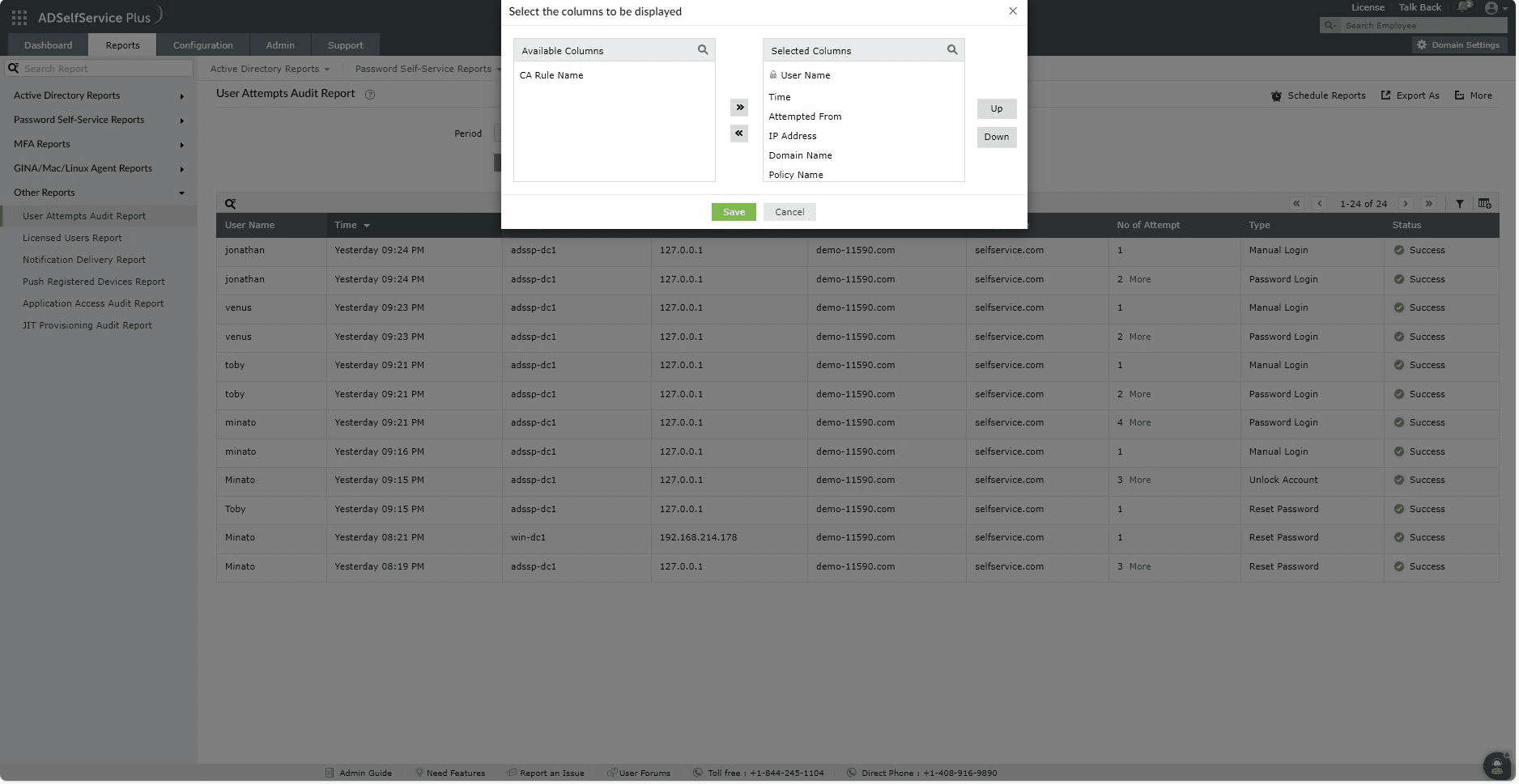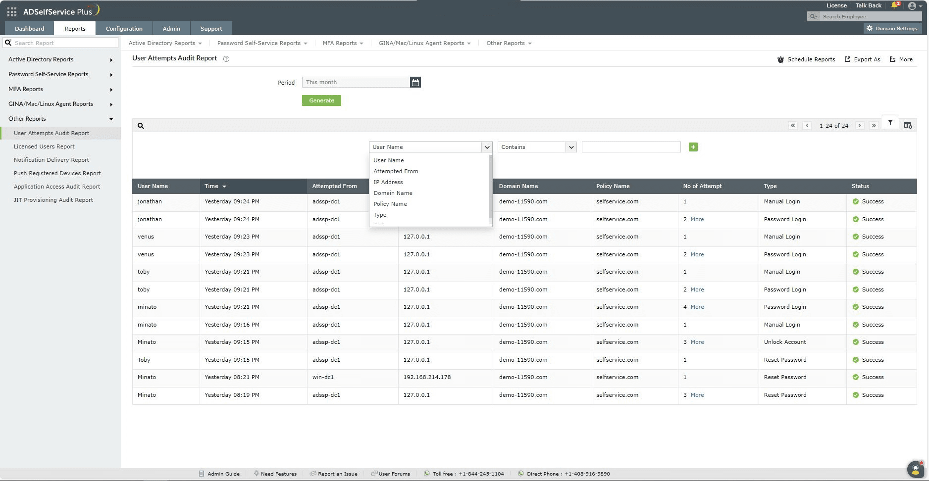 - 管理者またはオペレーター権限でADSelfService Plusポータルにログインし、[レポート]→[その他のレポート]→[ユーザー試行の監査レポート]に移動します。