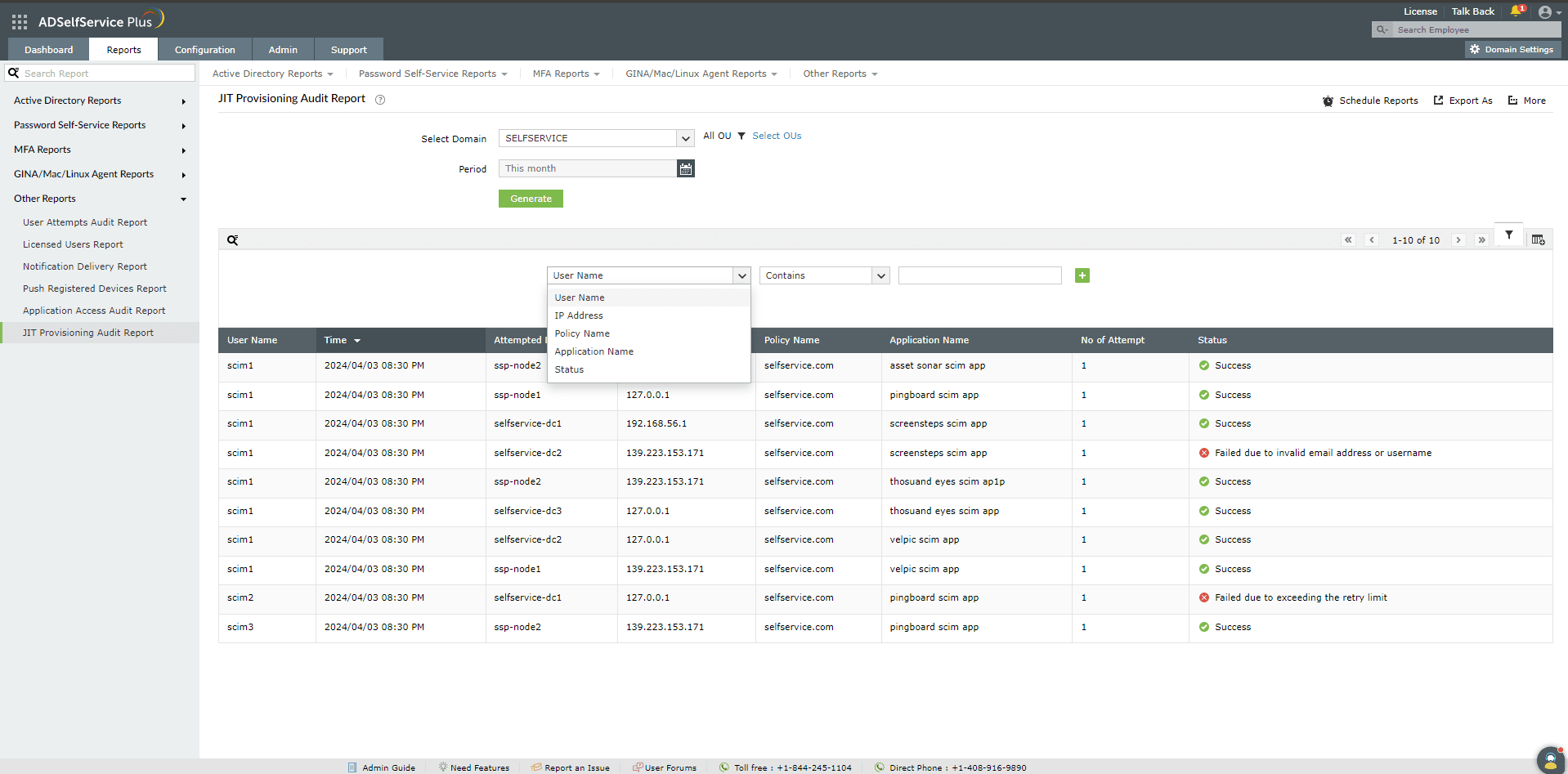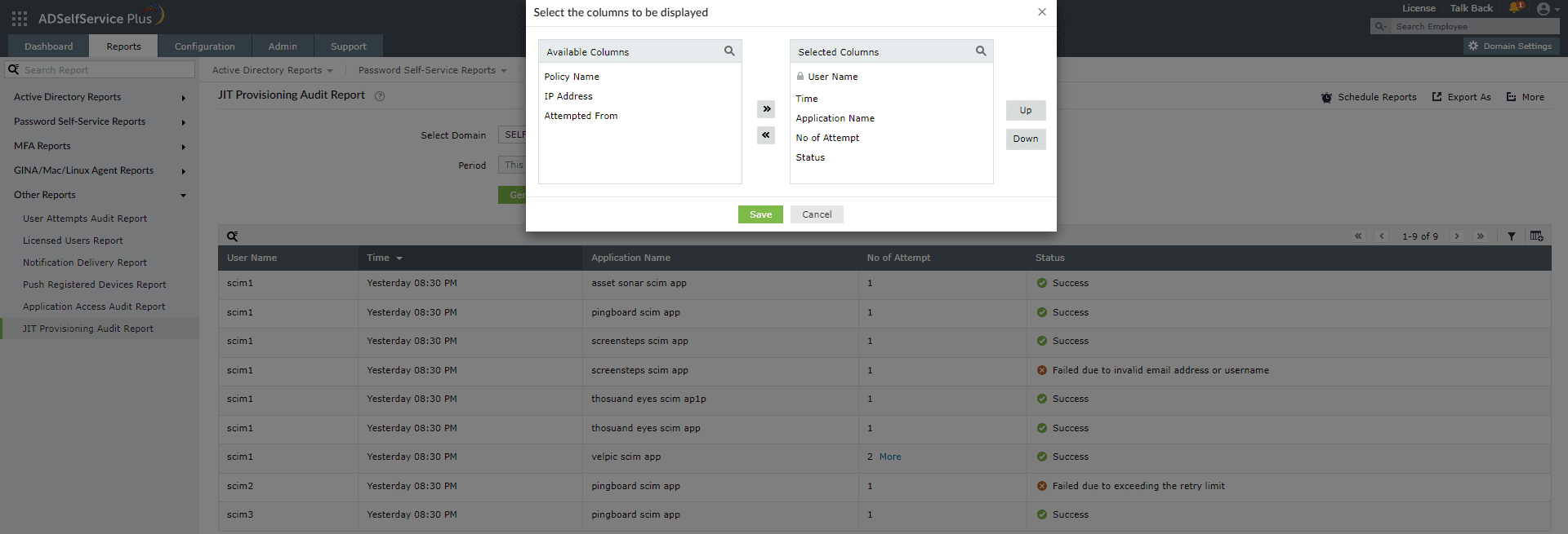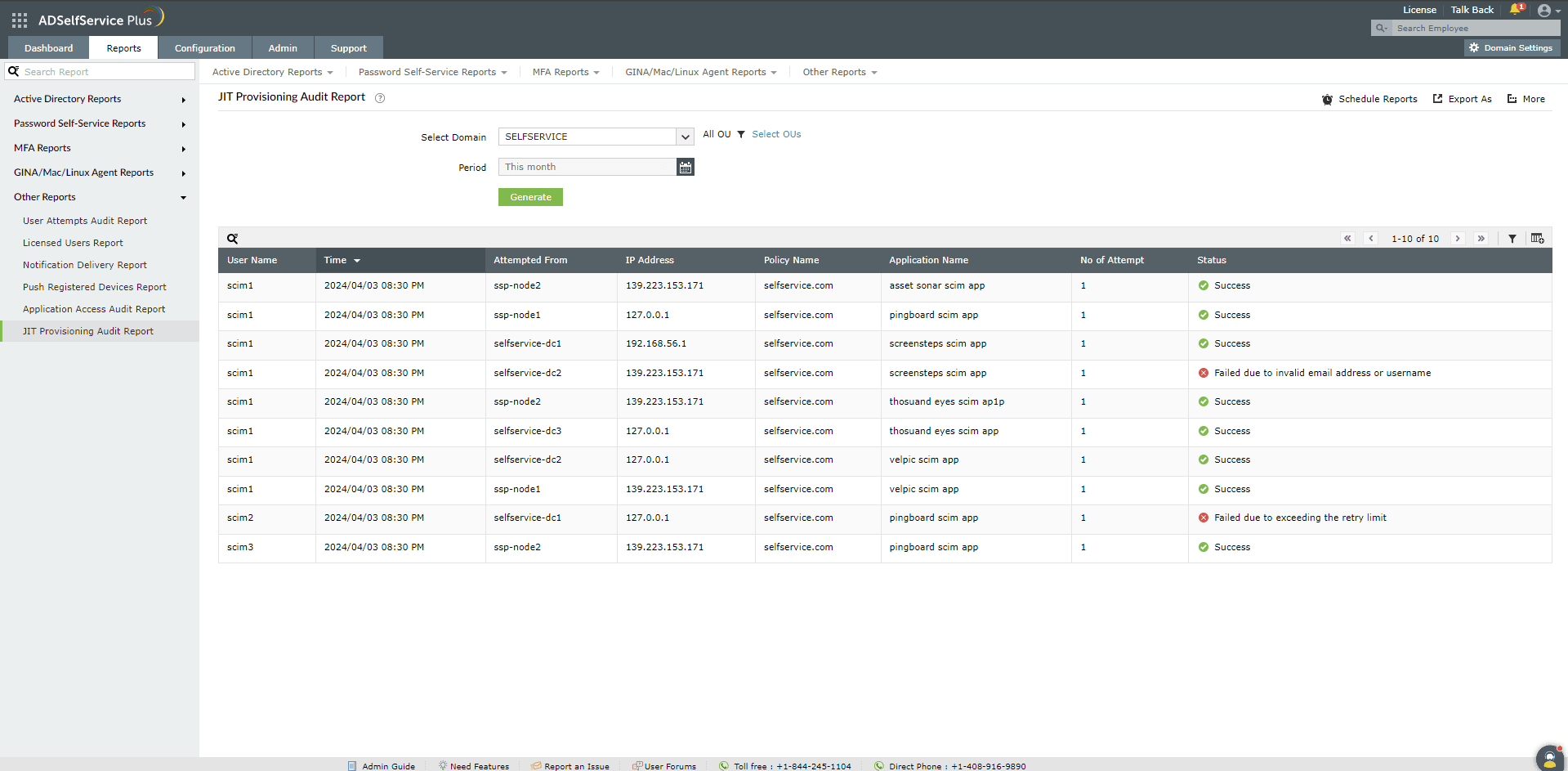 - ADSelfService Plus管理ポータルにログインし、[レポート]→[その他のレポート]→[JITプロビジョニング監査レポート]に移動します。