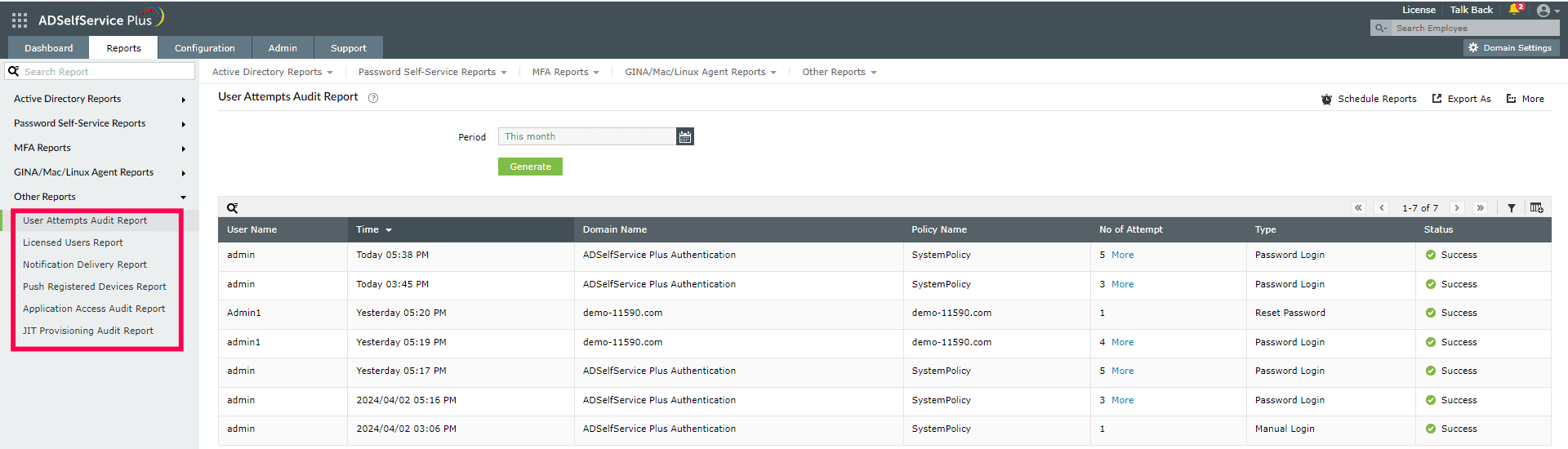 ライセンスユーザーレポートには、ADSelfService Plusのライセンスが割り当てられているユーザーが一覧表示されます。レポートに表示される情報は、ユーザーのライセンスを効率的に管理するために活用できます。レポート作成手順については、こちらをご参照ください。ADSelfService Plusのライセンスの詳細については、こちらをご参照ください。