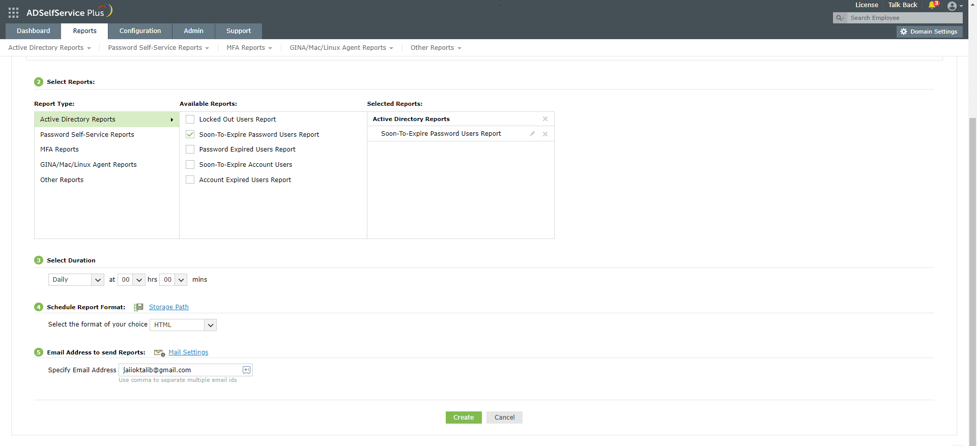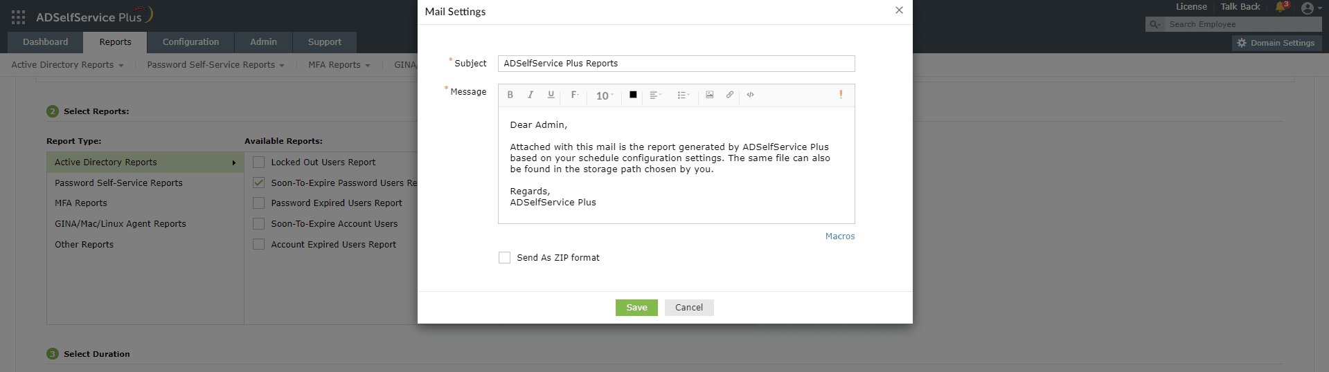 ]オプションを使用することで、レポートを自動的に作成し、管理者やユーザーの上司にメールで送信できます。