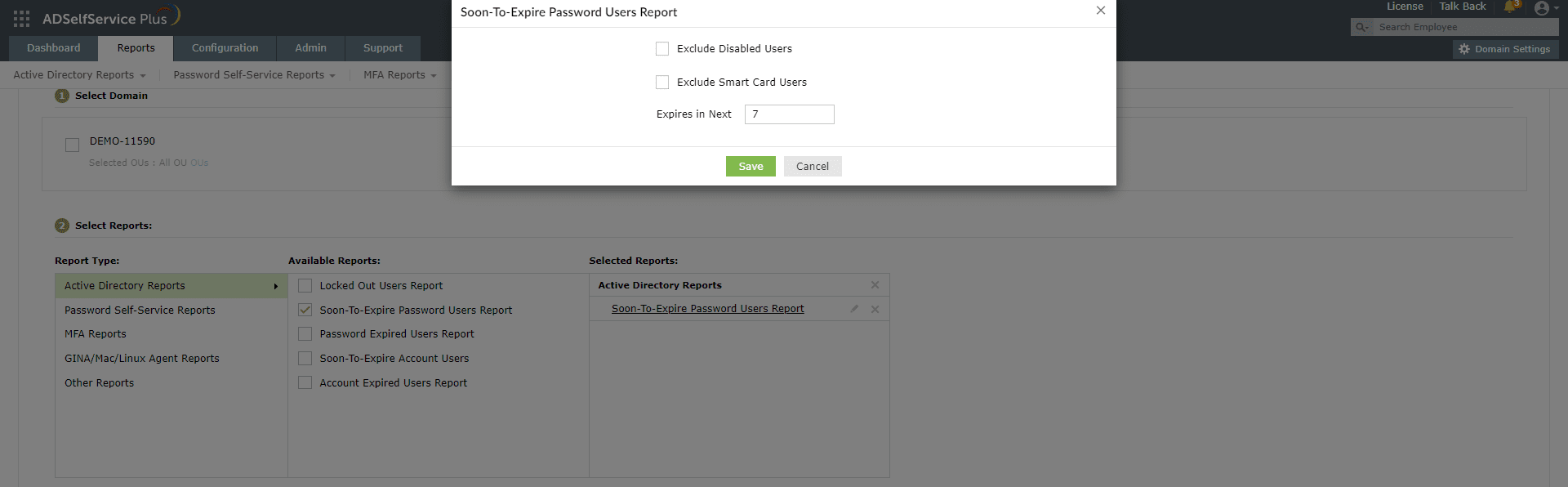 ]をクリックして、作成するレポートにフィルターを適用できます。 - Active Directoryレポートは、有効期限が切れるまでの日数、無効なユーザー、スマートカードユーザーなどの特定の条件に基づいてフィルタリングできます。