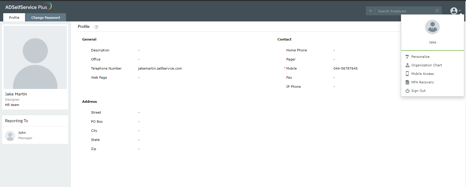 ADSelfService Plusユーザーポータルで登録タブが利用できない場合は、プロファイルアイコンをクリックし、表示されるプロファイルメニューから[MFA回復]を選択します。