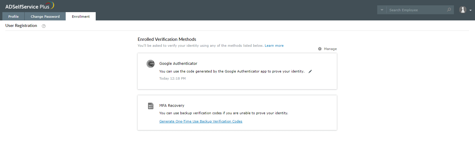 ADSelfService Plusユーザーポータルで、[登録]に移動します。初めてバックアップコードを生成する場合、「MFA回復」フィールドで、[1回限りのバックアップ検証コードを生成する]を選択します。バックアップコードを以前生成したことがある場合は、編集アイコンを選択します。 - プロファイルアイコン