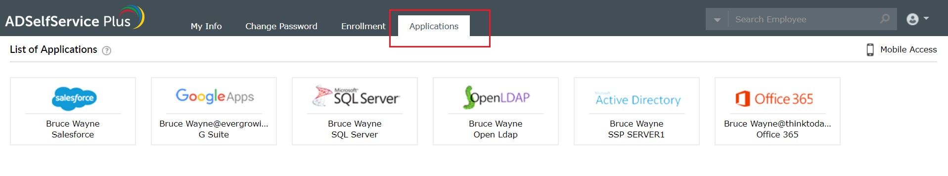 ADSelfService Plusにログインすれば、組織内で利用する各アプリケーションにワンクリックでアクセスできます。