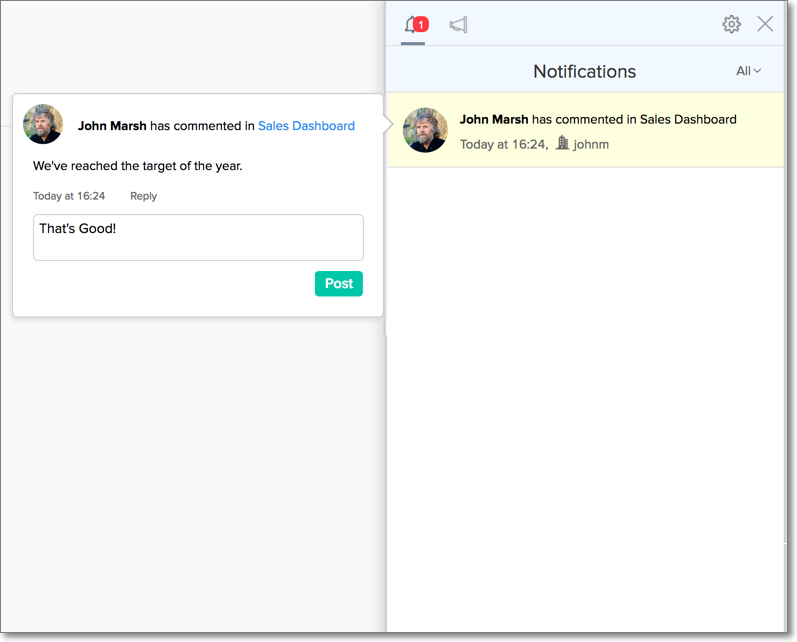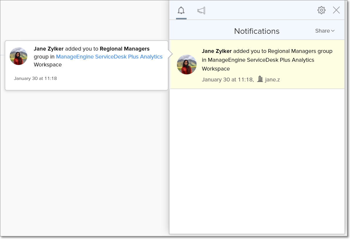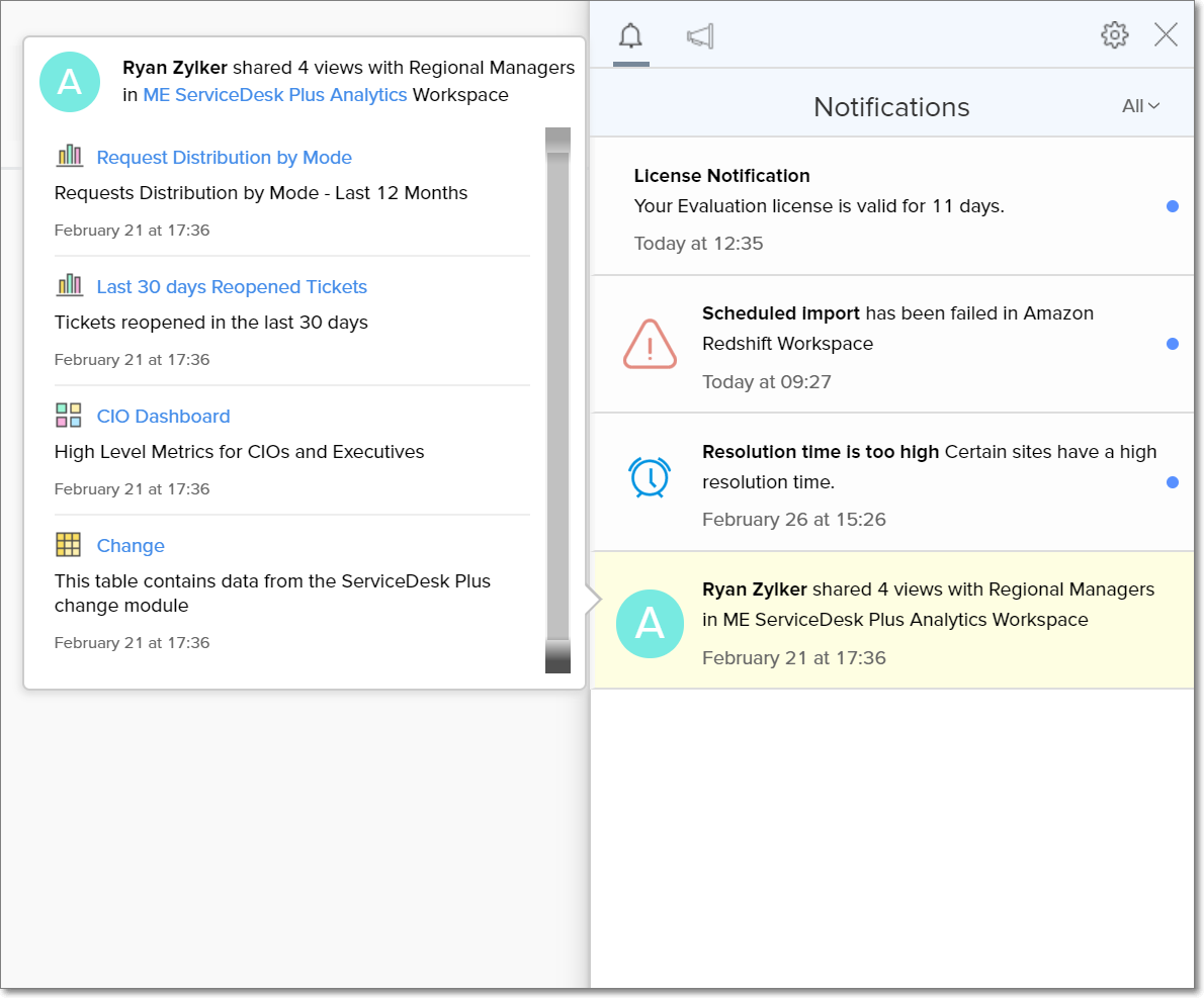 このオプションを有効にすると、レポート、ダッシュボードまたはテーブルが共有されたときに通知が届きます。これらの共有されたレポートは、通知フィードからアクセスできます。共有についての詳細は、「Sharing Views to a User」を参照してください。