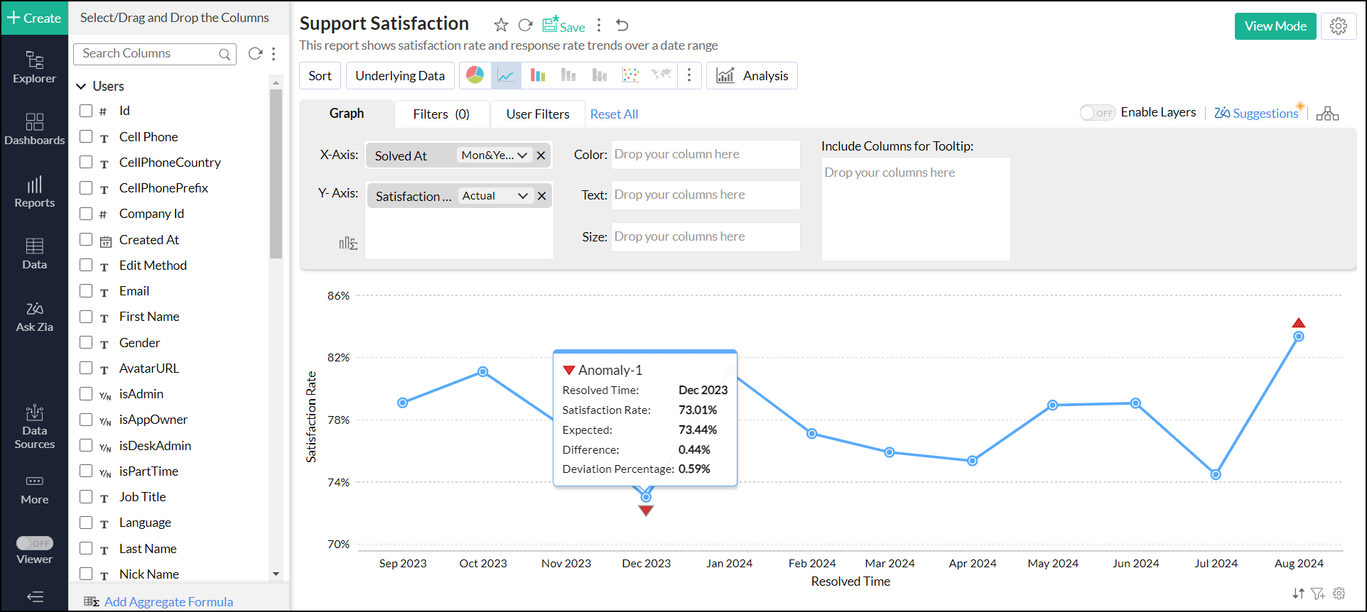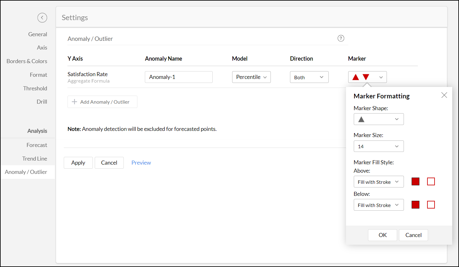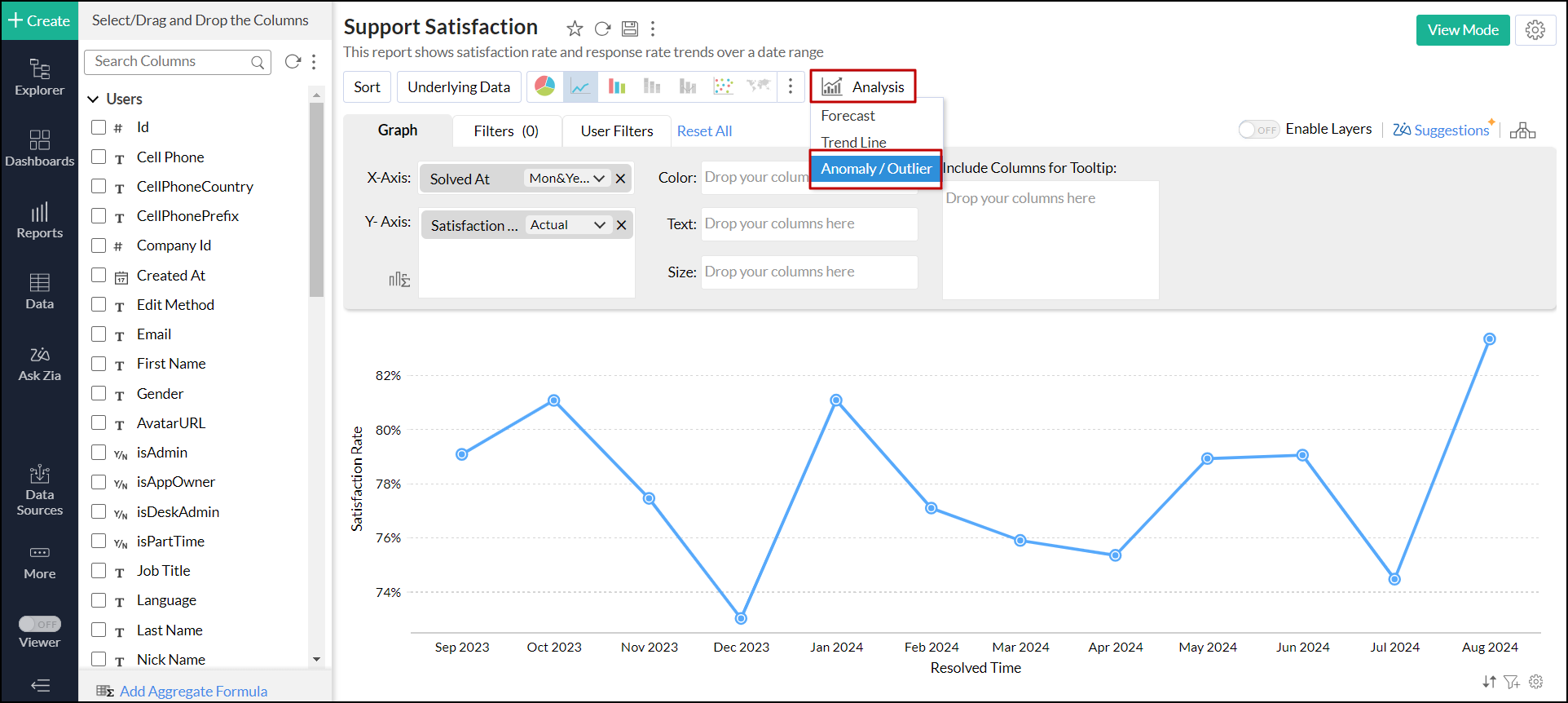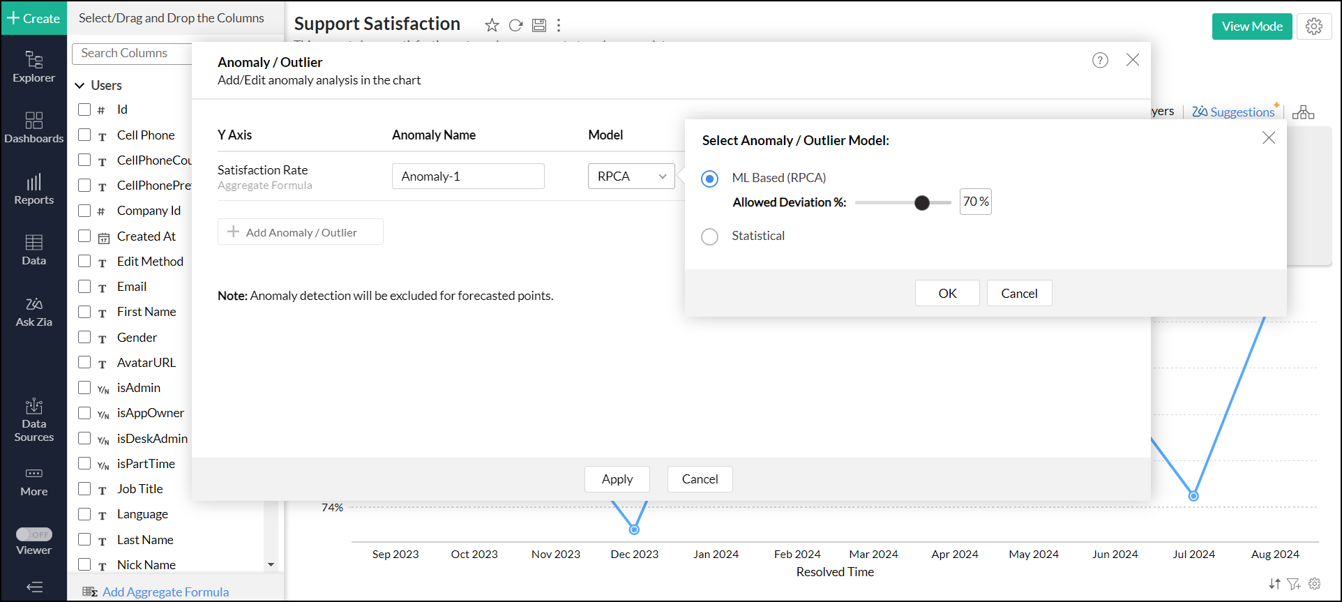 - すべての種類の折れ線グラフと棒グラフで異常または外れ値の検出がサポートされています。