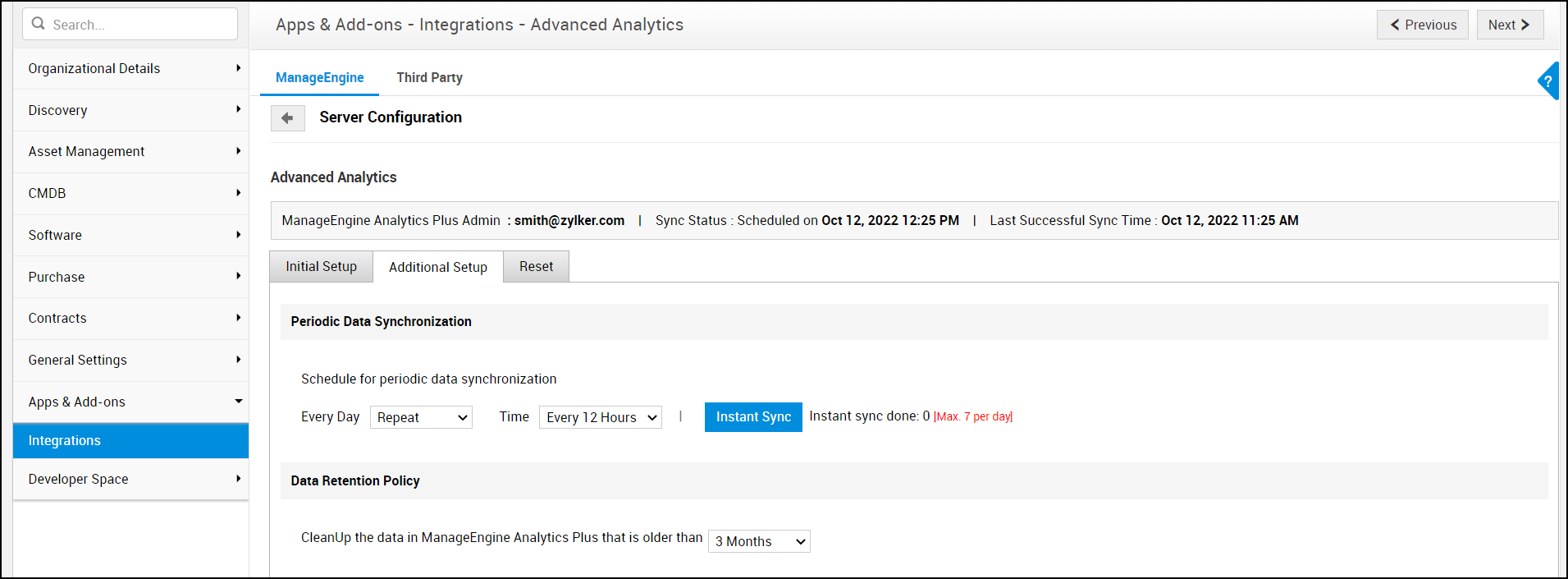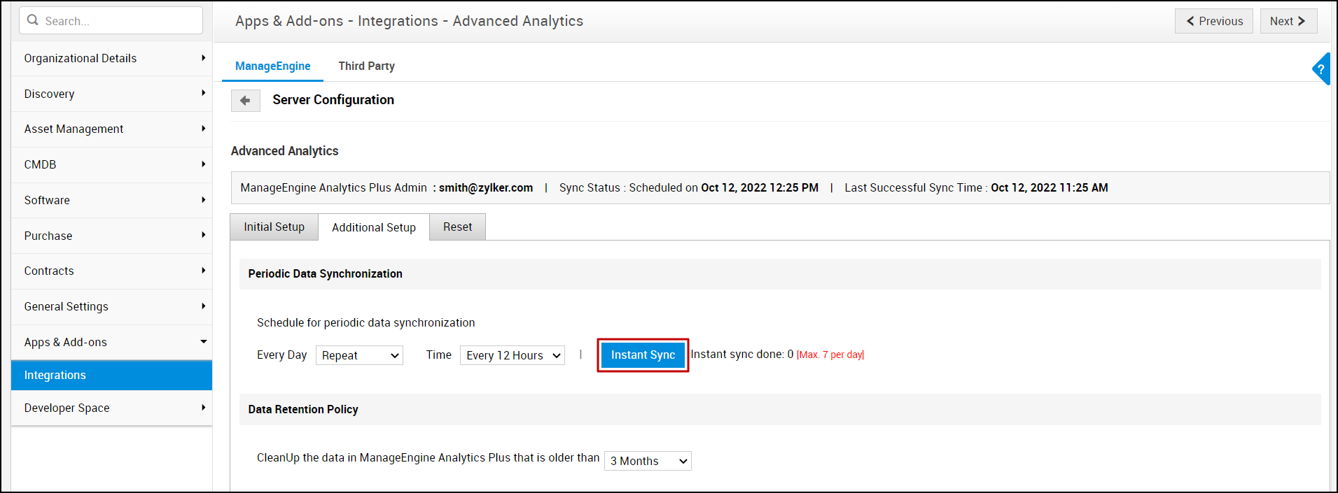 - [追加セットアップ]タブに移動し、[即時同期]ボタンをクリックします。