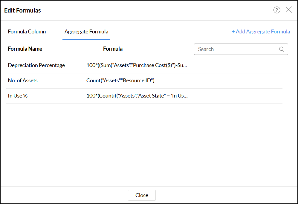 数式は、必要なレポートを作成する強力な数式エンジンを使って定義できます。詳細は、このドキュメントを参照してください。AssetExplorerモジュールに基づいて作成されたデフォルトの数式もいくつかあります。デフォルトの数式を表示するには、必要なテーブルを開き、[追加]をクリックして、[数式を編集]オプションを選択します。