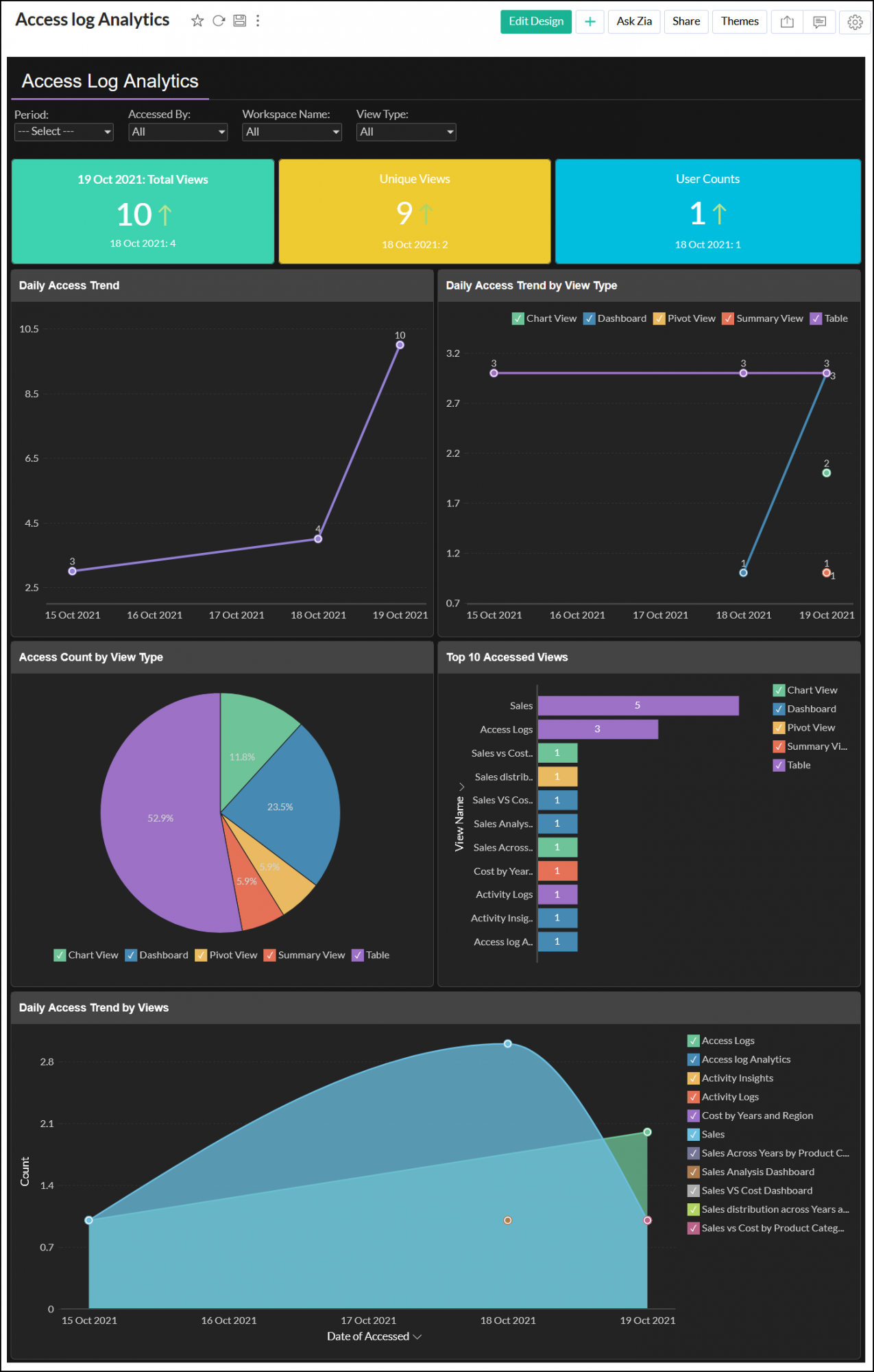 日次のアクセストレンド、レポートタイプ別、ユーザータイプ別のアクセス数等のアクセスログに関するダッシュボードやレポートも自動作成されます。