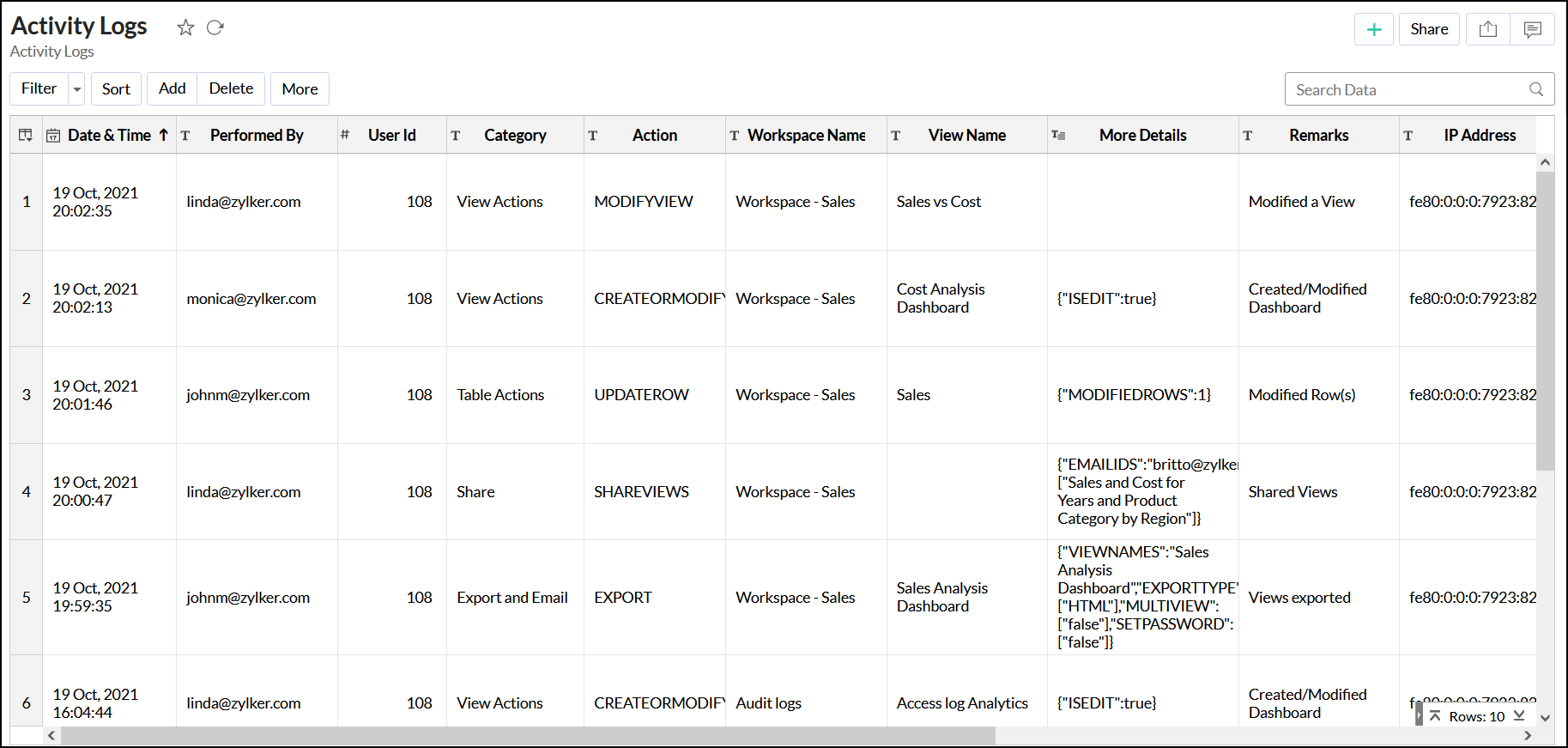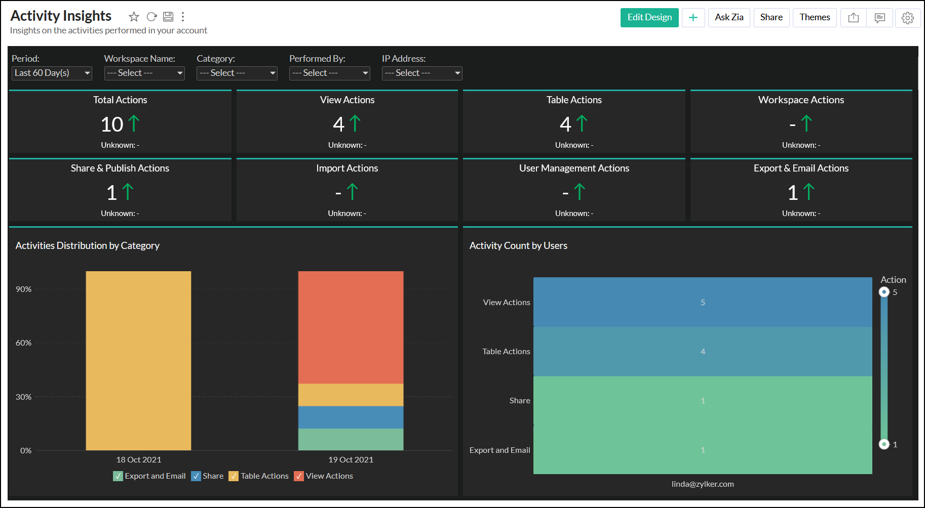 データのインポート、レポートの作成、レポートの共有等、ユーザーが実行した操作を記録します。