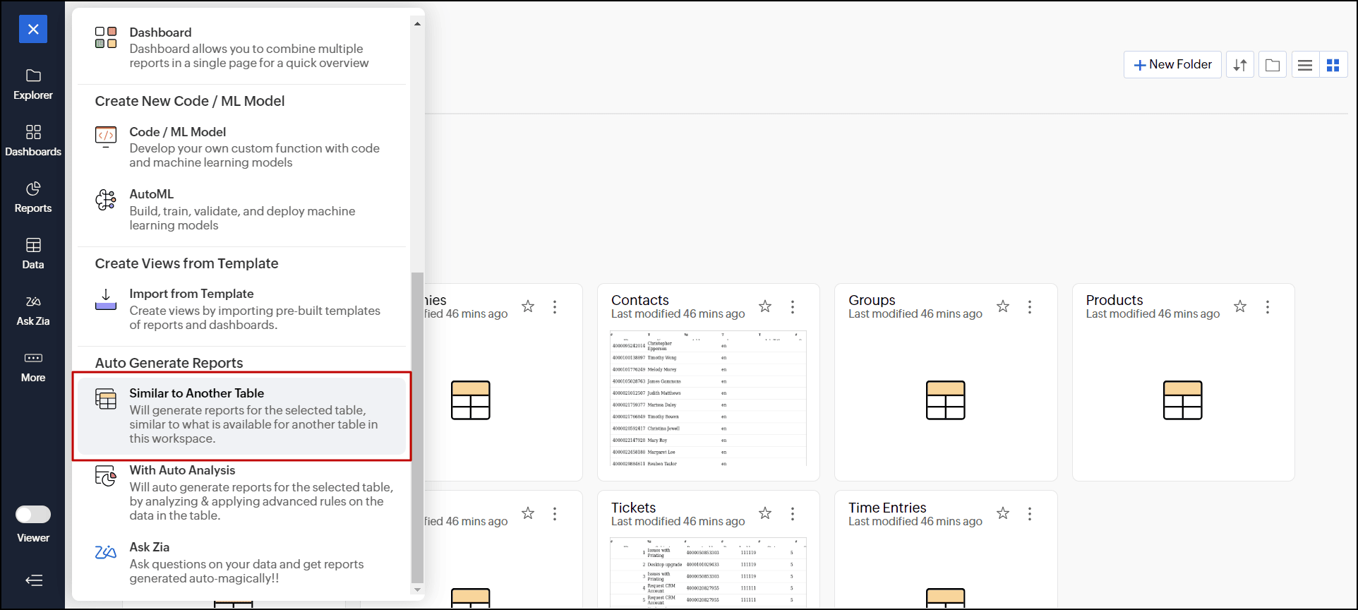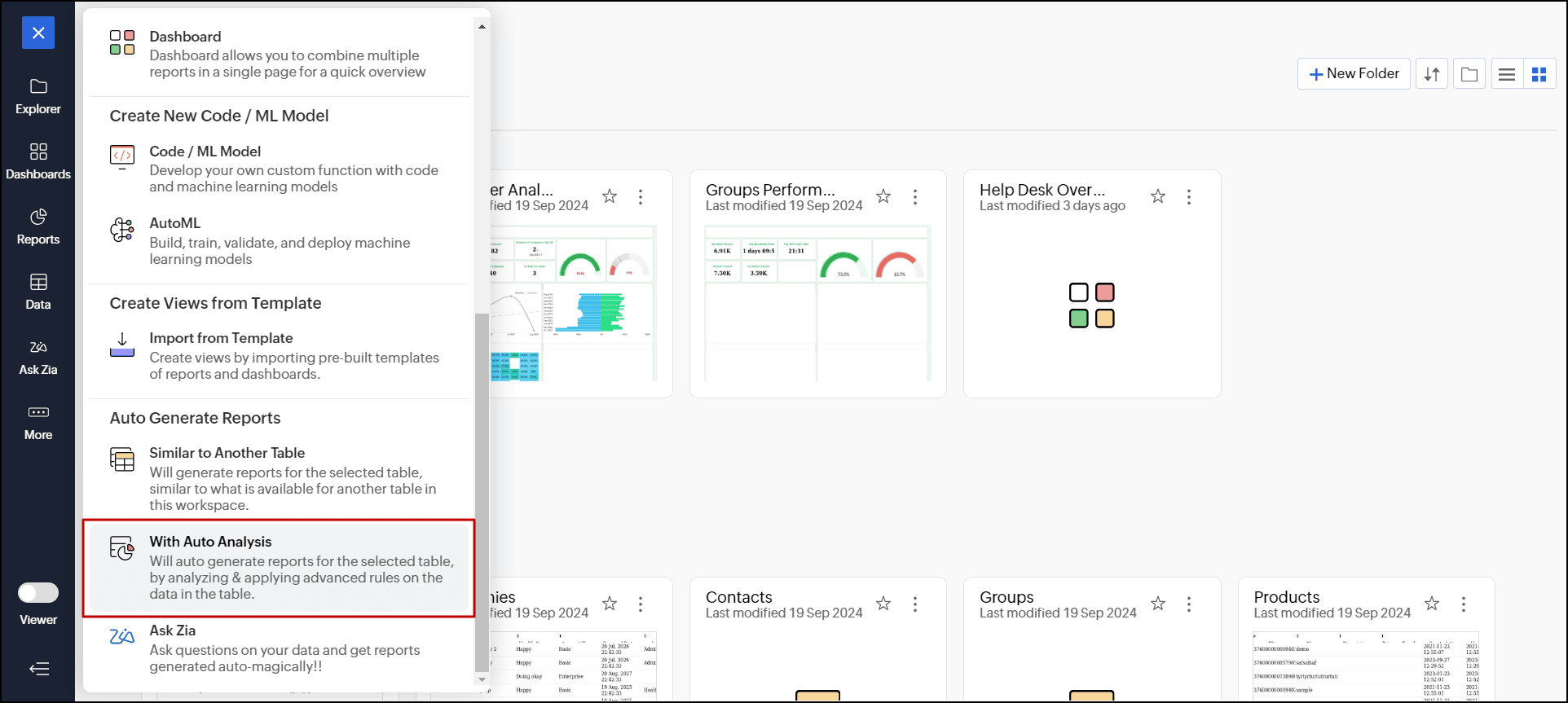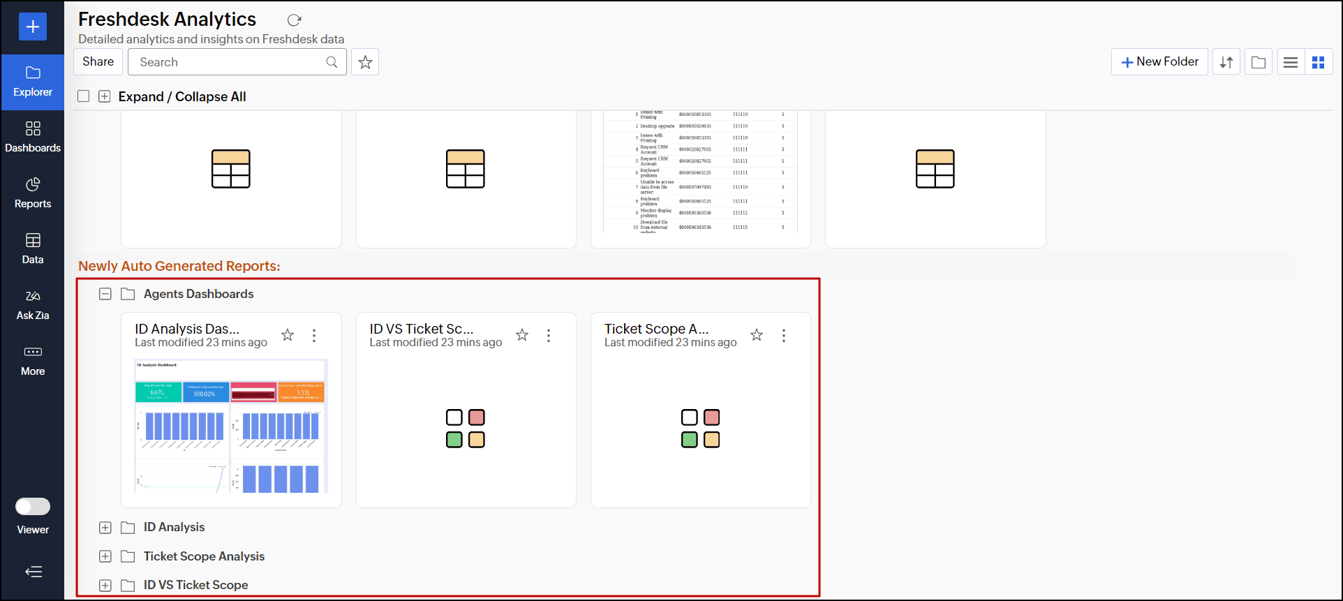 自動生成されたレポートとダッシュボードは、新規フォルダーとして追加されます。