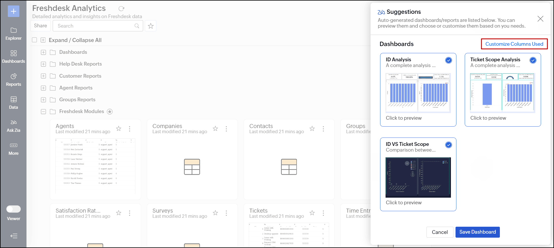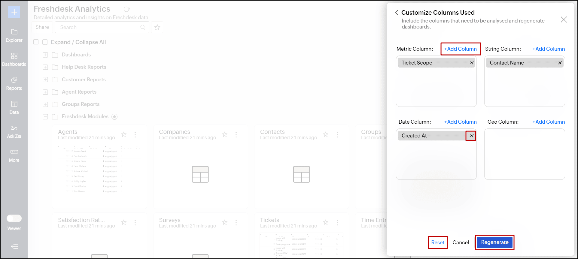 カラムはデータの種類に基づいて分類されます。分析に追加のカラムを含めるには[列を追加する]をクリックし、分析対象からカラムを除外するには削除アイコンを使用します。[再作成する]をクリックすると、変更内容に基づいてダッシュボードが生成されます。カラム情報を元に戻すには、[リセットする]をクリックします。