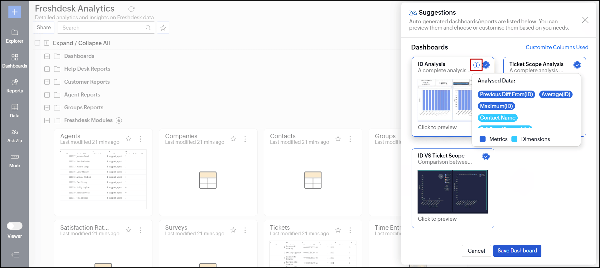 作成対象のダッシュボードにカーソルをあてたときに表示される情報アイコンをクリックすると、分析データの指標や軸が表示されます。指標 カラムに使用される分析データは濃い青で強調表示され、軸カラムは水色でマークされます。
