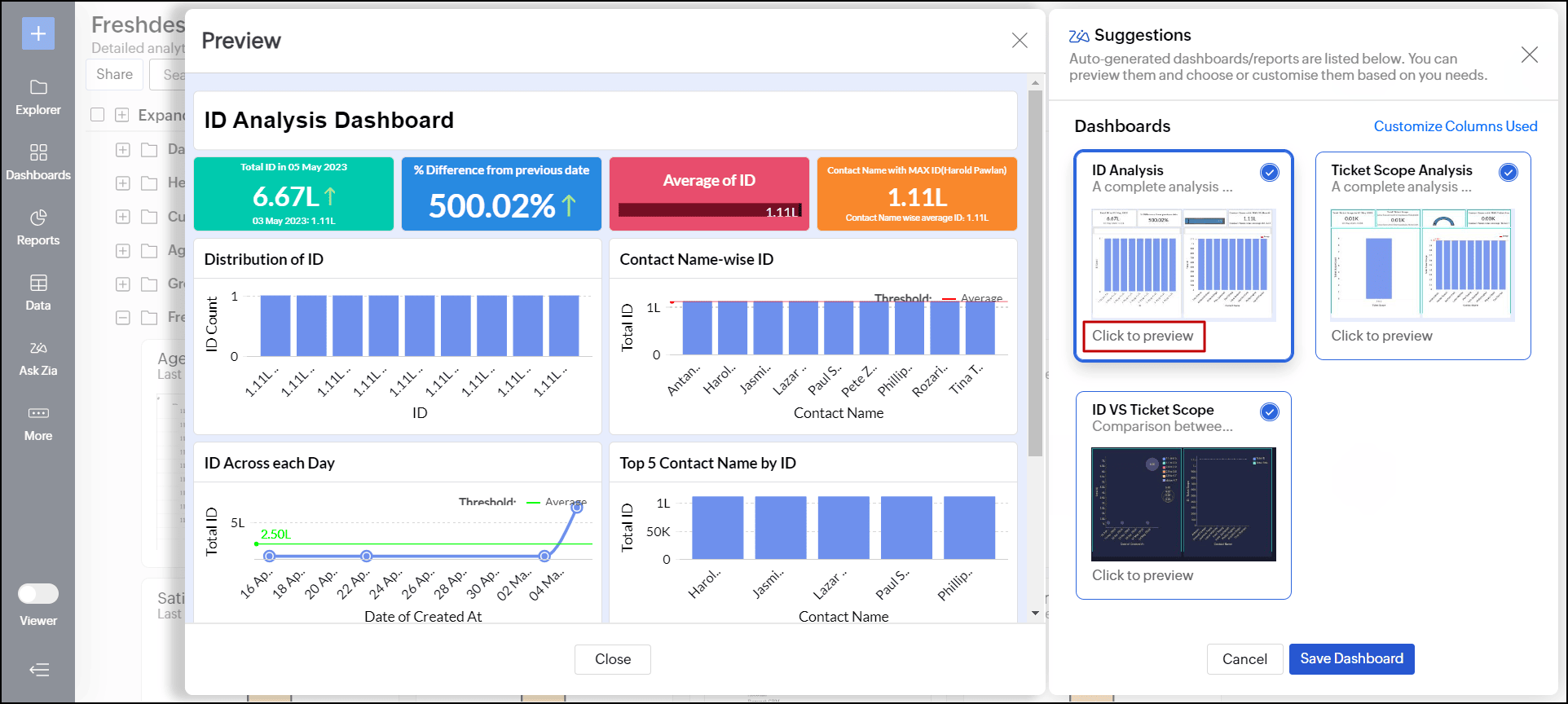 各ダッシュボードの下部にある [プレビューするにはクリックしてください] をクリックすると、ダッシュボードとレポートを確認できます。