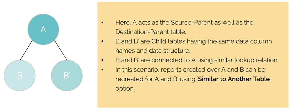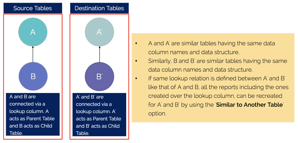 - レポートを正常に複製するには、参照元テーブル間で定義された参照関係を宛先テーブル間で定義する必要があります。