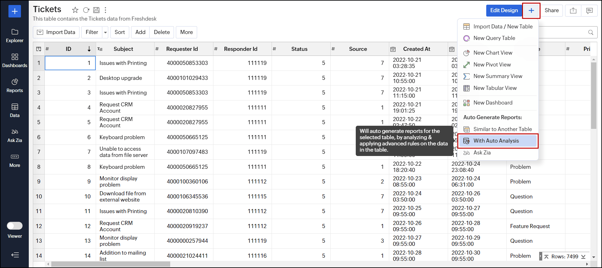 レポートとダッシュボードを自動生成する対象のテーブルを開き、[+アイコン(新しく作成)]→[自動分析]をクリックします。