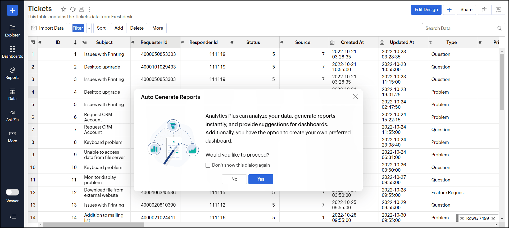 新しいテーブルにデータを正常にインポートすると、レポートとダッシュボードの自動生成に関する確認画面が表示されます。
