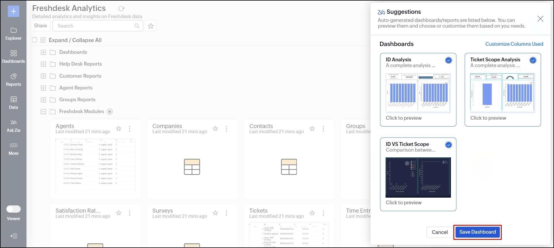 作成対象のダッシュボードを選択し、[ダッシュボードを保存する]をクリックしてレポートとダッシュボードをワークスペースに追加します。