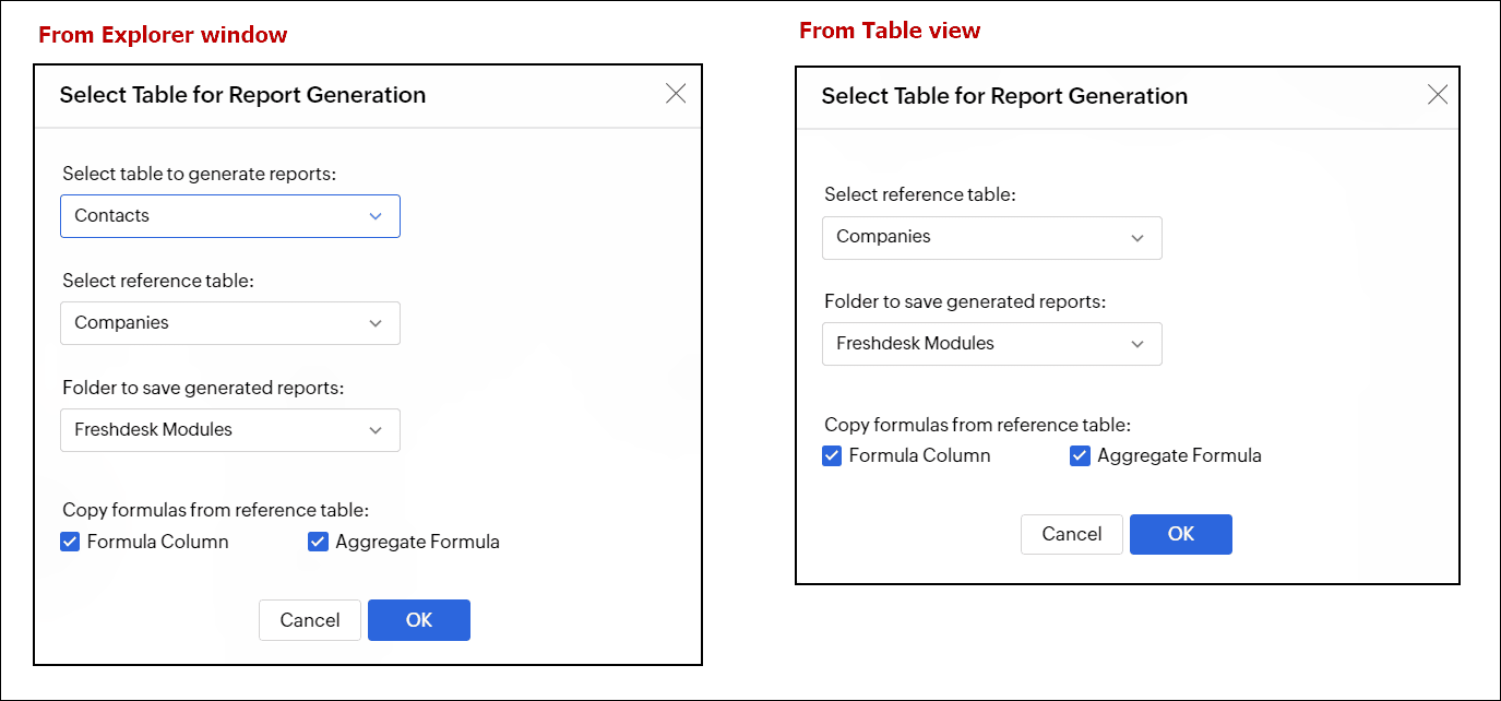 表示されるポップアップで、[レポートを作成するテーブルを選択する]からレポートを生成する対象のテーブルを選択します。 - [参照先のテーブルを選択する]から、レポートとダッシュボードを再作成する参照元テーブルを選択します。