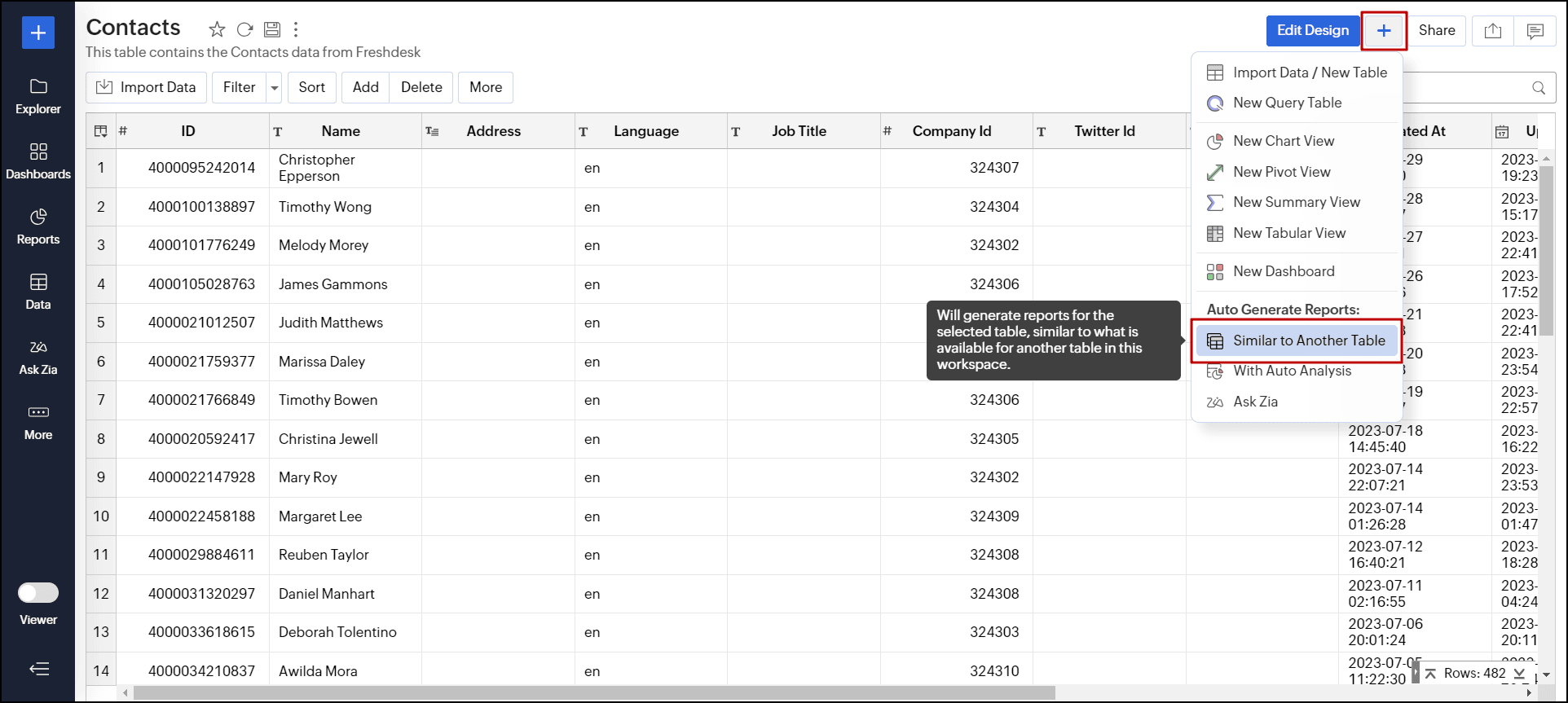 [他のテーブルと同様に作成する]オプションでは、例として既存のデータセットに類似した新しいデータセットをAnalytics Plus Cloudにインポートし、そのインポートしたデータセットに対して同様のレポートを作成したい場合に、既存のレポートを使用してレポートを再生成できるようになります。