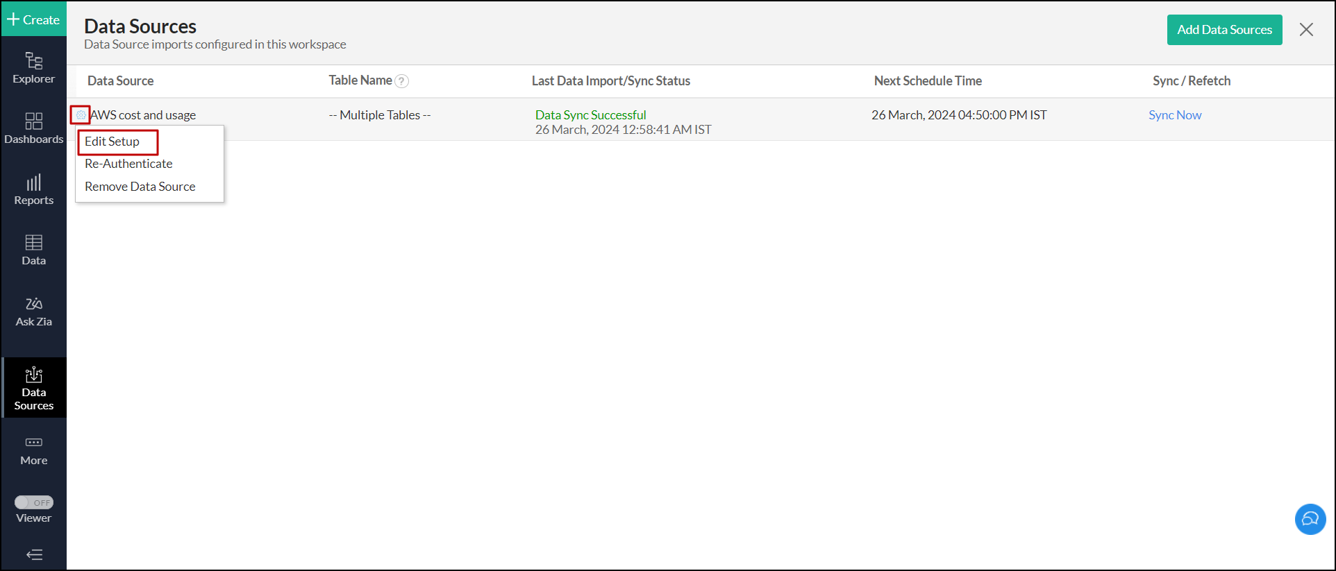 - AWSコストと使用状況データソースにカーソルを当てて表示される[設定]アイコンをクリックし、 [セットアップを編集]オプションを選択します。