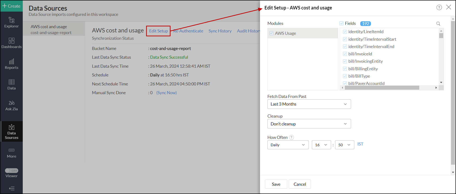 - AWSコストと使用状況 Cloudデータソースに移動し、[セットアップを編集]リンクをクリックします。