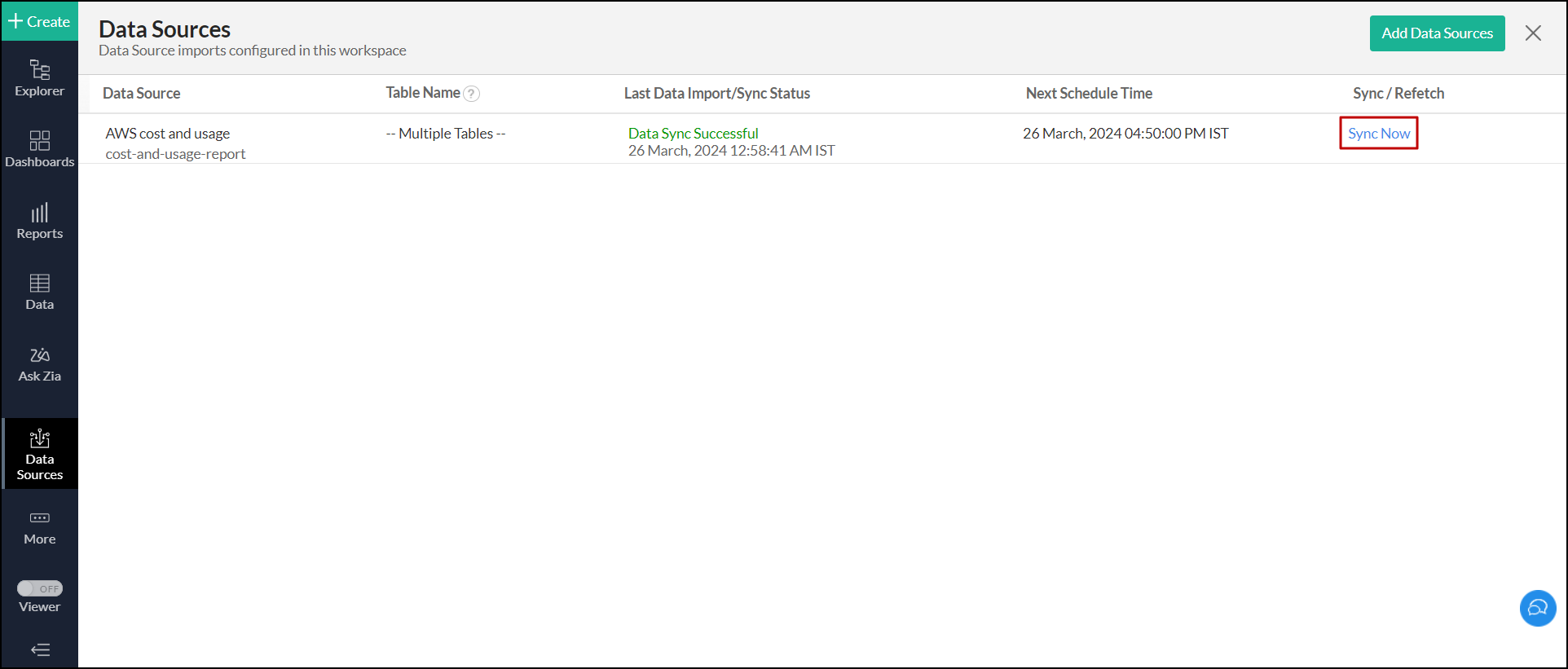 はい。これを行うには、サイドパネルの[データソース]オプションをクリックします。表示されるページで、AWSコストと使用状況 Cloudソースに移動し、対応する[今すぐ同期]ボタンをクリックします。