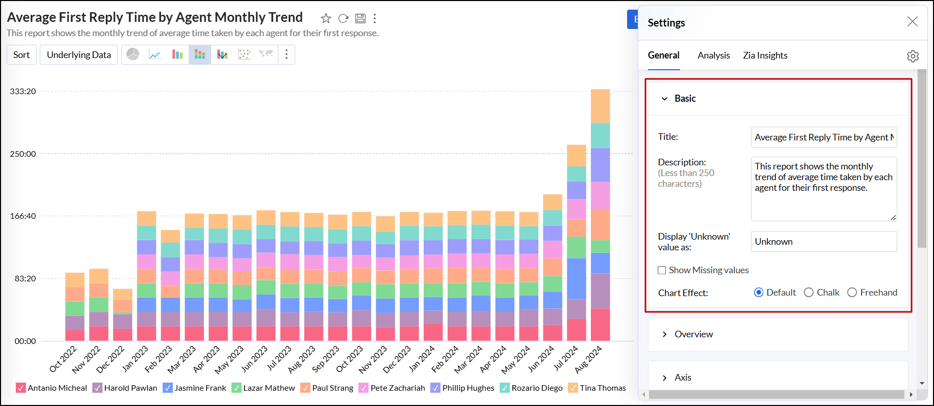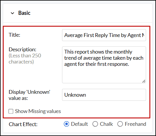 このセクションでは、タイトル、説明、欠損値の表示、およびその他のチャート別オプション等、レポートの基本詳細情報をカスタマイズできます。