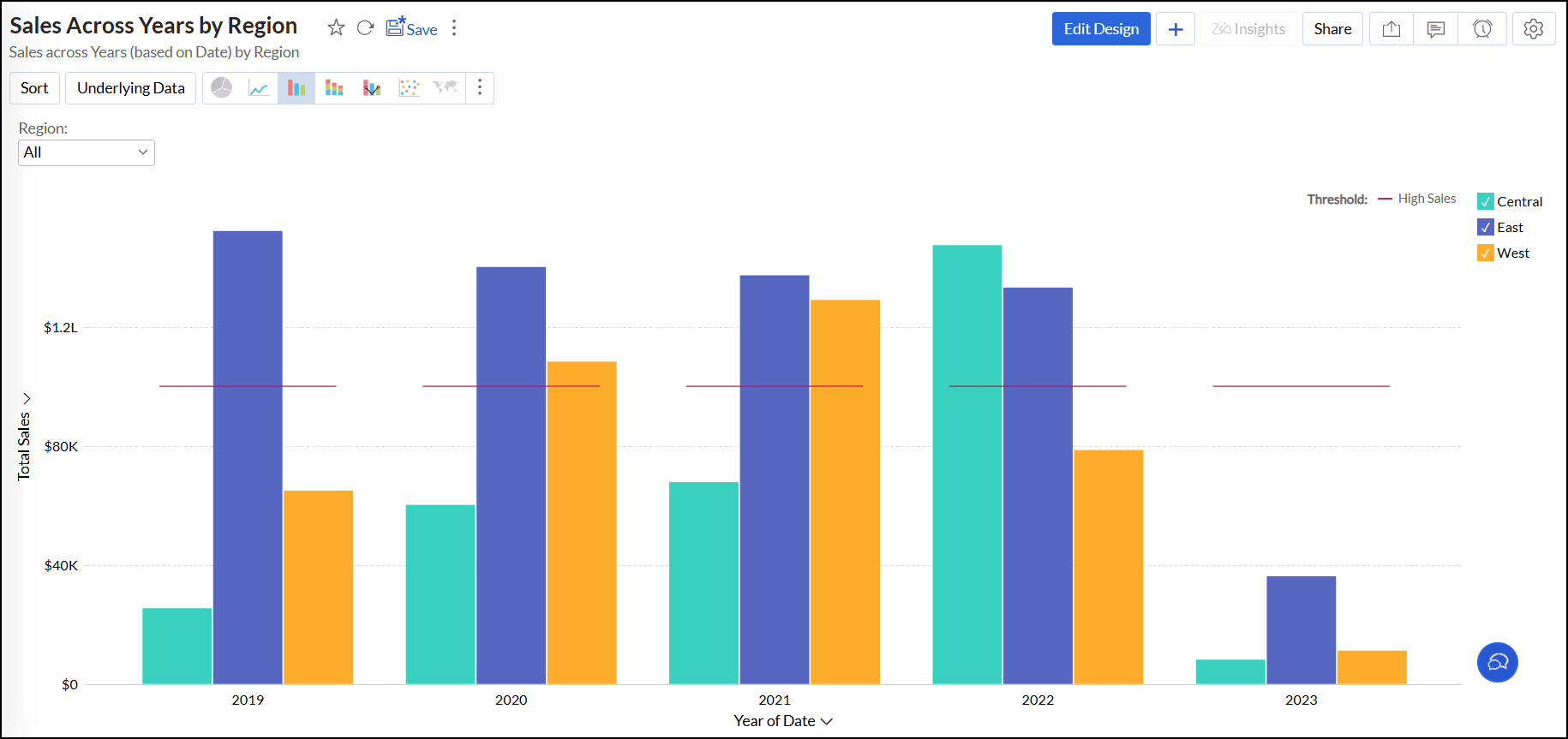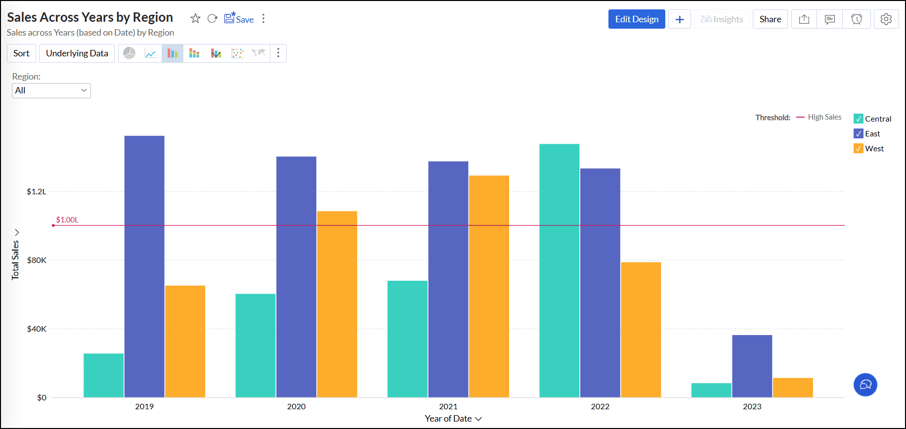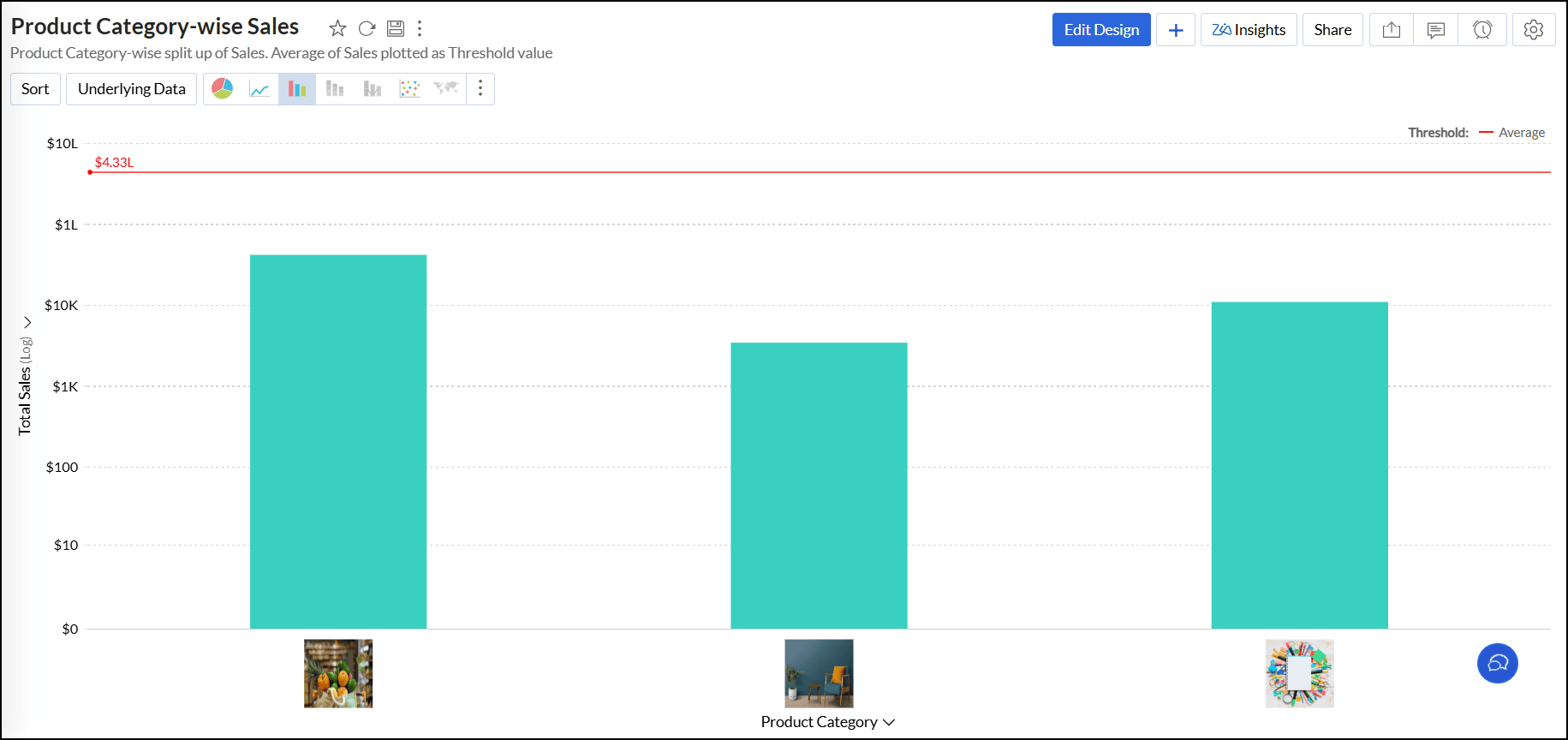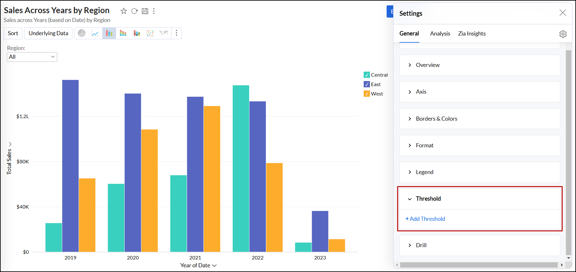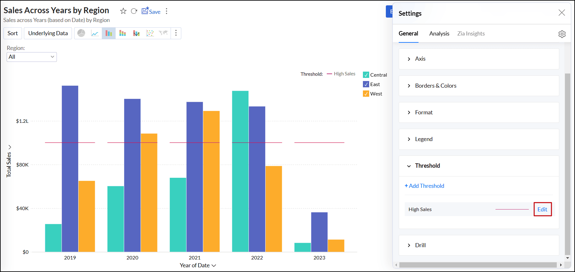 閾値とは、チャート内の個別データポイントまたはリージョンを強調表示するのに使う事前定義済の値または制限です。これで、特定閾値と適合または同値を超える値を視覚的に区別できます。閾値線は、チャートのXまたはY軸の固定値で水平または垂直に追加できます。Analytics Plusでは、2つのタイプの閾値を設定できます。