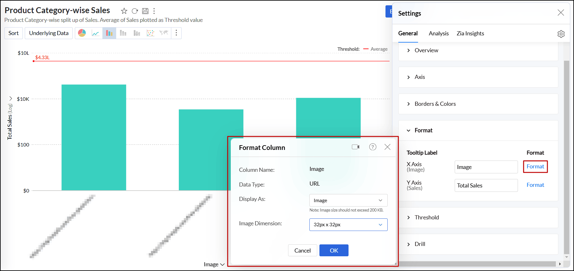 - 名前:軸に名前を指定します。デフォルトでは、対応する列名は、軸ラベルとして設定されています。数値データタイプの場合、 軸ラベル名の横の形式リンクをクリックして、列値を形式設定することもできます。